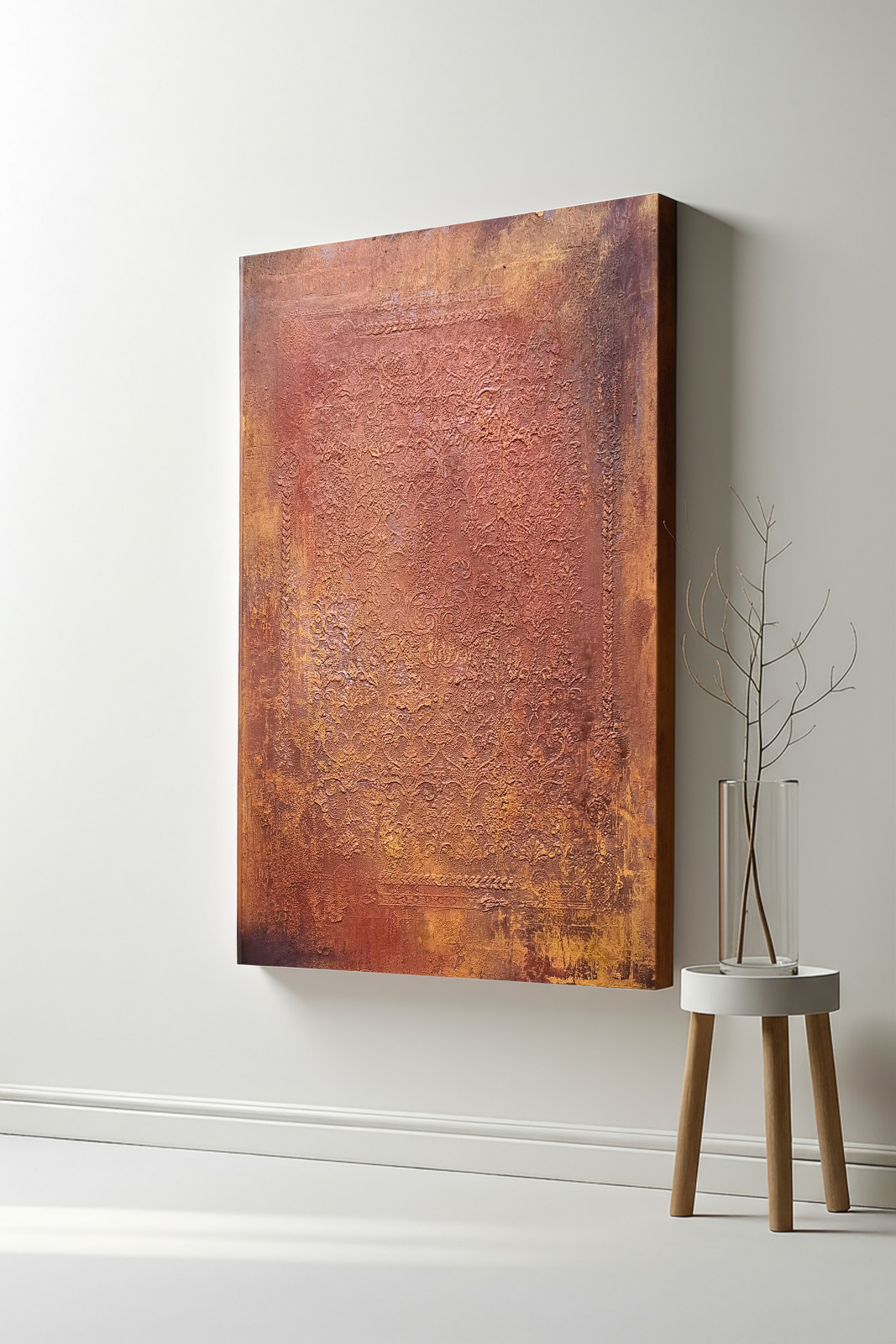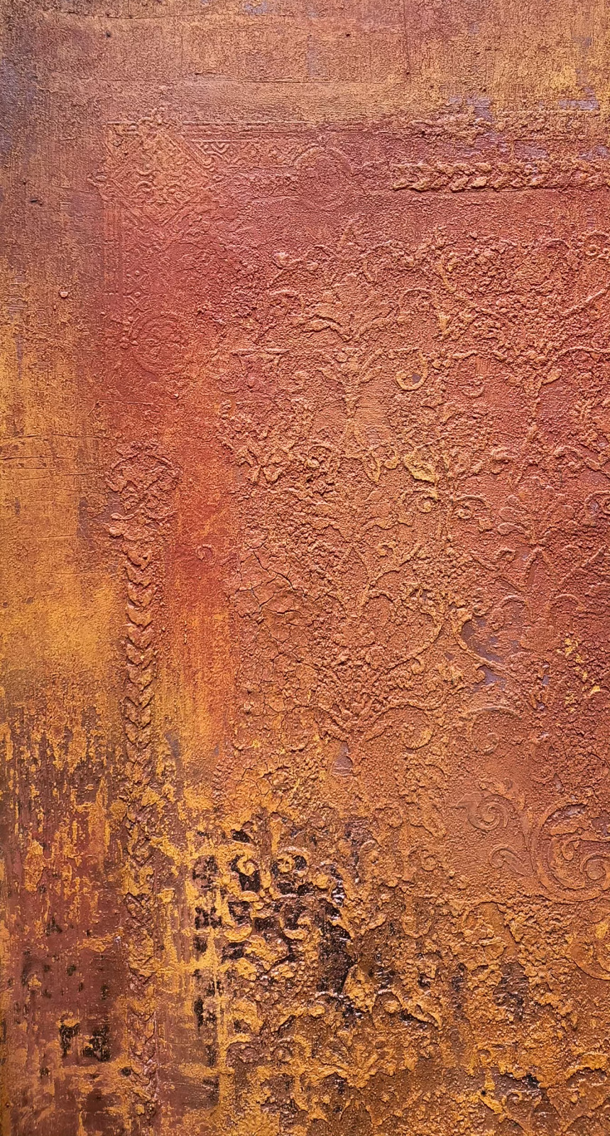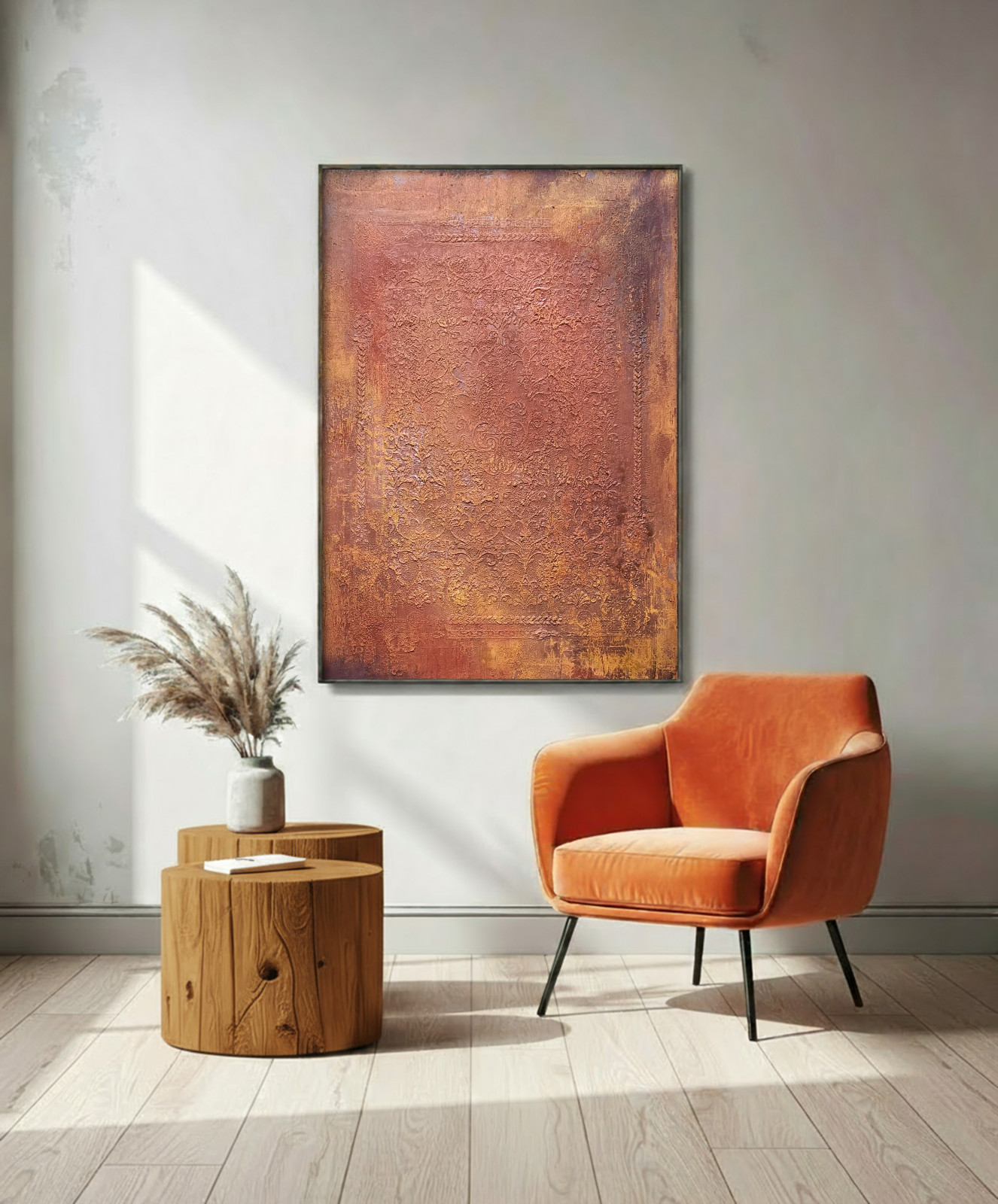 Mixed media na płótnie (100×140 cm): pasta strukturalna, naturalne pigmenty ziemne, akryl i medium akrylowe, zabezpieczone matowym werniksem.