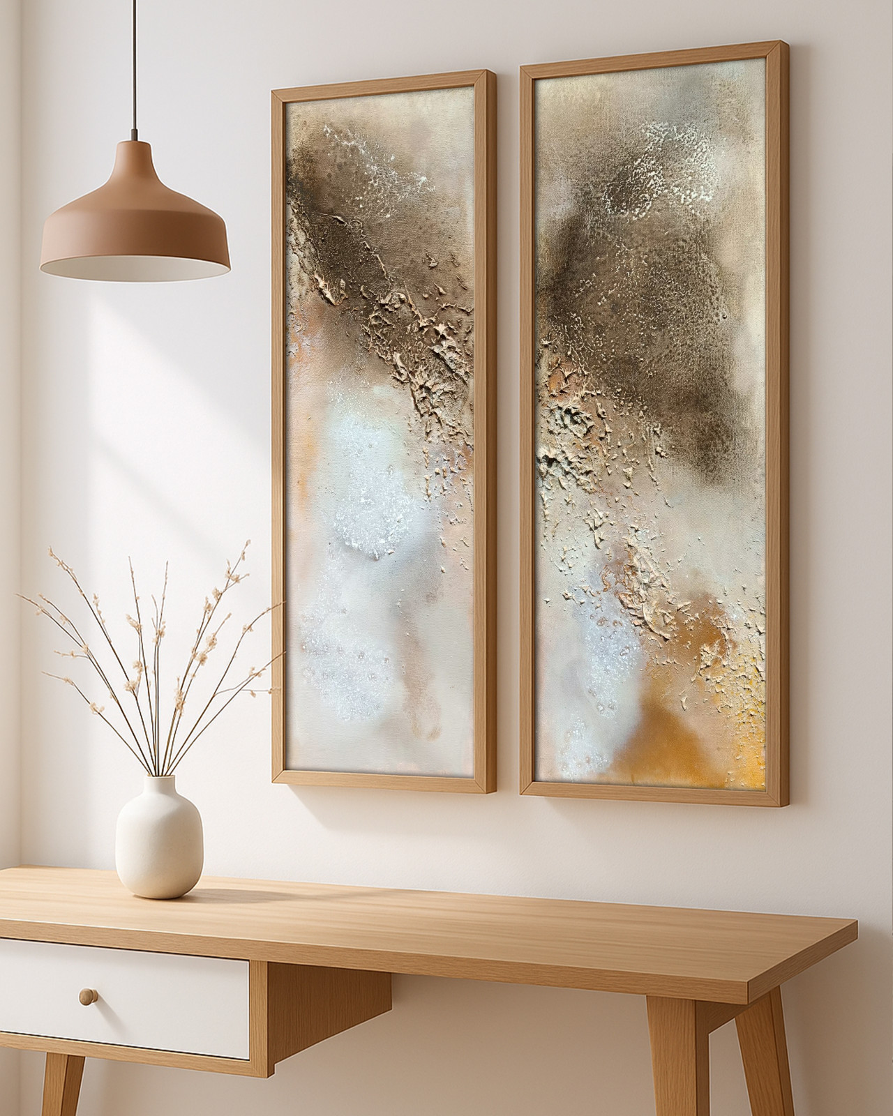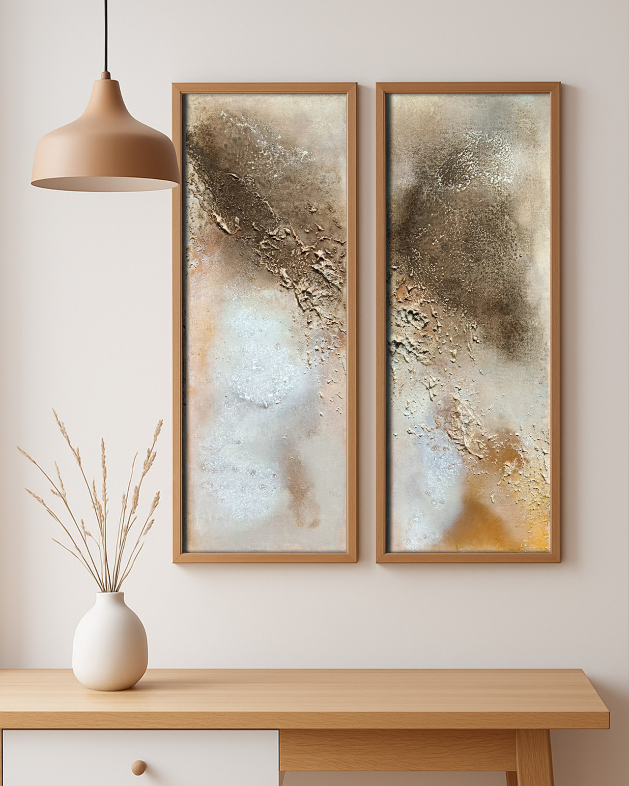 Wykonany z naturalnych pigmentów ziemnych, akrylu, pasty strukturalnej i odrobiny artystycznej magii, całość wykończona matowym werniksem. Każdy z obrazów (30 × 80 cm) tworzy połowę tej smakowitej opowieści – razem 60 × 80 cm szczerej przyjemności dla oka.