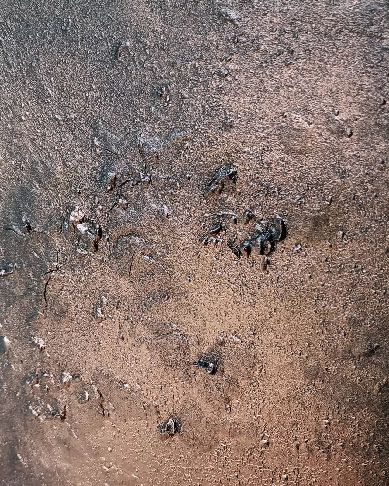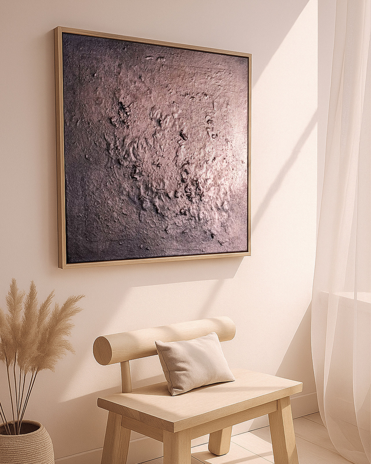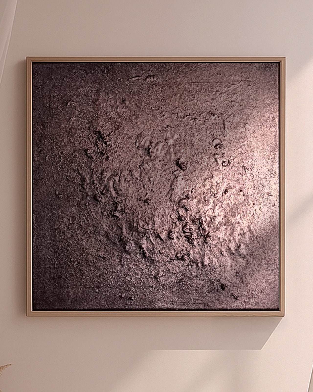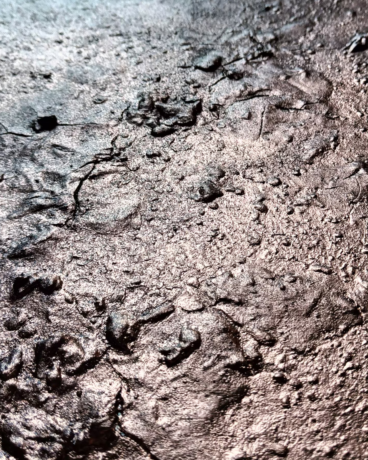 „Na glinianych nogach” to 50 × 50 cm obraz abstrakcyjny, zbudowany z gliny, naturalnych pigmentów ziemnych, akrylu i pigmentów metalicznych. Efekt? Tekstura, która przypomina jednocześnie archeologiczne znalezisko i futurystyczny kawałek pejzażu. Surowa, ale z połyskiem. Stabilna, choć z przymrużeniem oka — bo przecież nawet najsolidniejsze rzeczy w życiu stoją czasem właśnie… na glinianych nogach.