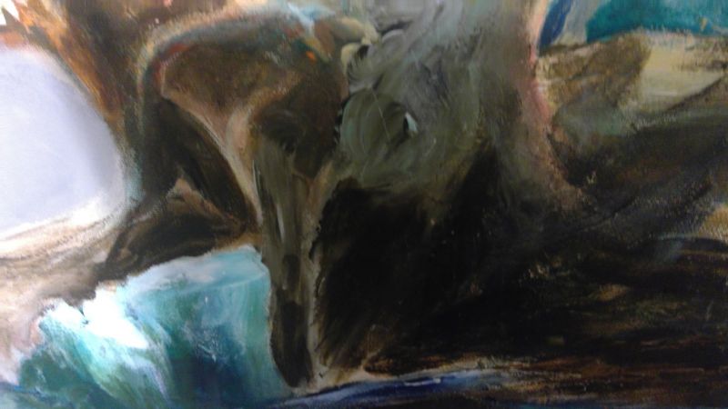 Obraz 100/70. Akryl na płótnie. Kompozycja inspirowana urodą krajobrazu wyspiarskiego. Zawieszona/ zatopiona w przestrzeni. Kompozycja dynamiczna. Z cyklu Wyspy niespokojne. Malowana w okresie pandemii (kwiecień 2020)