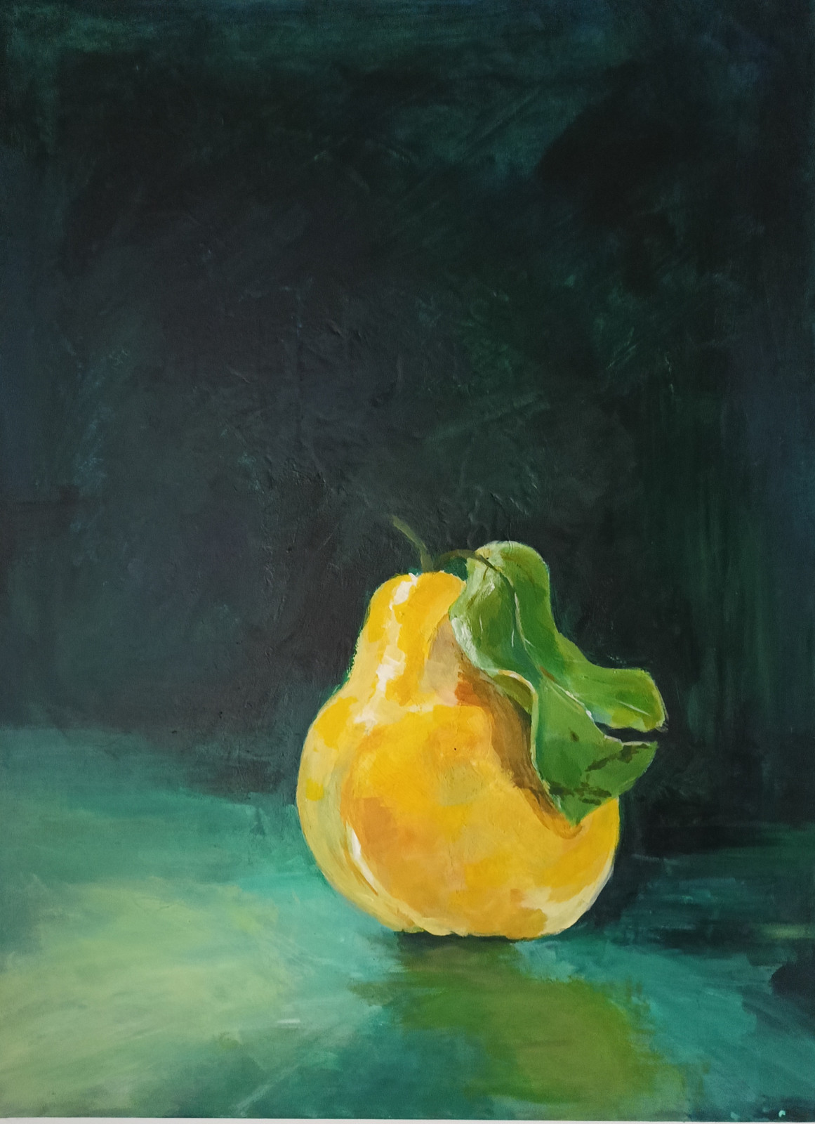 Obraz w technice akrylowej wykonany na płótnie o wymiarach 58 cm na 78 cm bez ramy. Kolorystyka w odcieniach turkusów, zieleni. Nowoczesny obraz do wnętrz z przedstawieniem pigwy z liściem w przestrzeni zieleni butelkowej, turkusów i czerni.