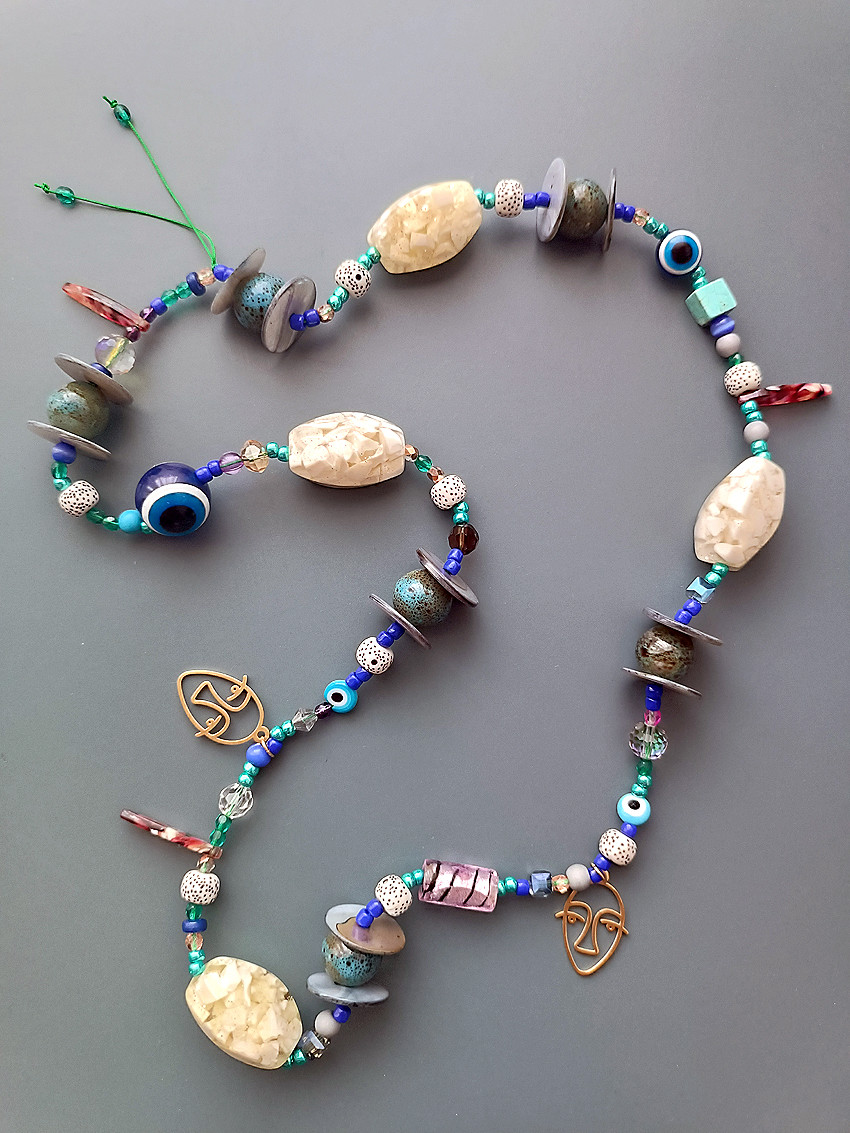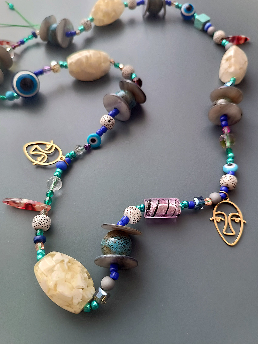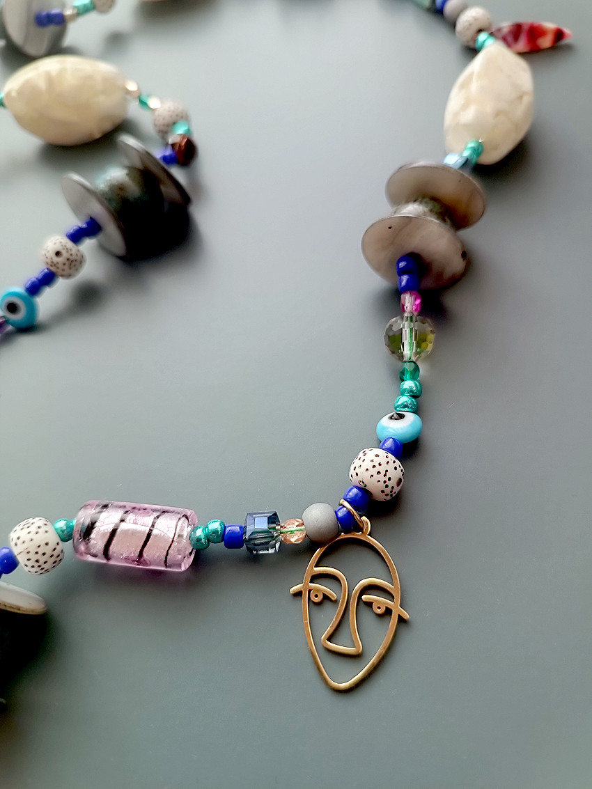 Niesamowicie oryginalny, bogaty i jedyny w swoim rodzaju- bo w jednym egzemplarzu naszyjnik wykonany z pięknych ceramicznych okrągłych korali, oraz z innych szklanych i akrylowych dużych korali. Twarze Picasso wykonane ze stali chirurgicznej w kolorze złotym. Do tego korale oko proroka to swoisty amulet! Naszyjnik niezwykle bogaty, Idealny na prezent dla osoby która nie boi się koloru! Naszyjnik wykonany został na mocnym sznurku jubilerskim. Zakładany przez głowę. Długość całkowita po złożeniu naszyjnika: ok 39cm