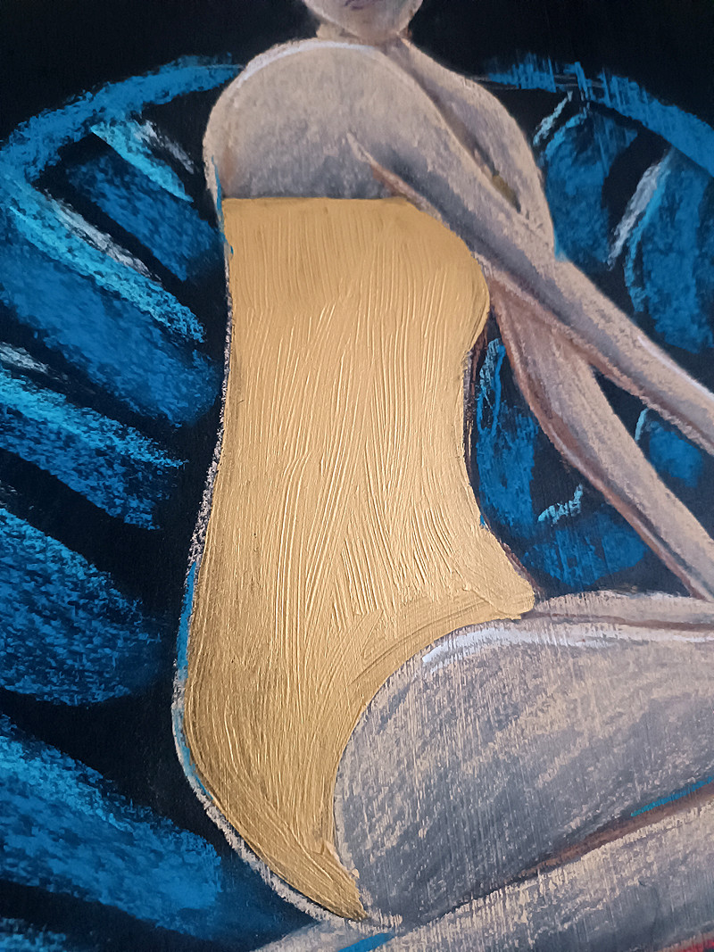 Obraz malowany na płycie, użyto farb akrylowych -czarna i złota , oraz suchych pasteli.