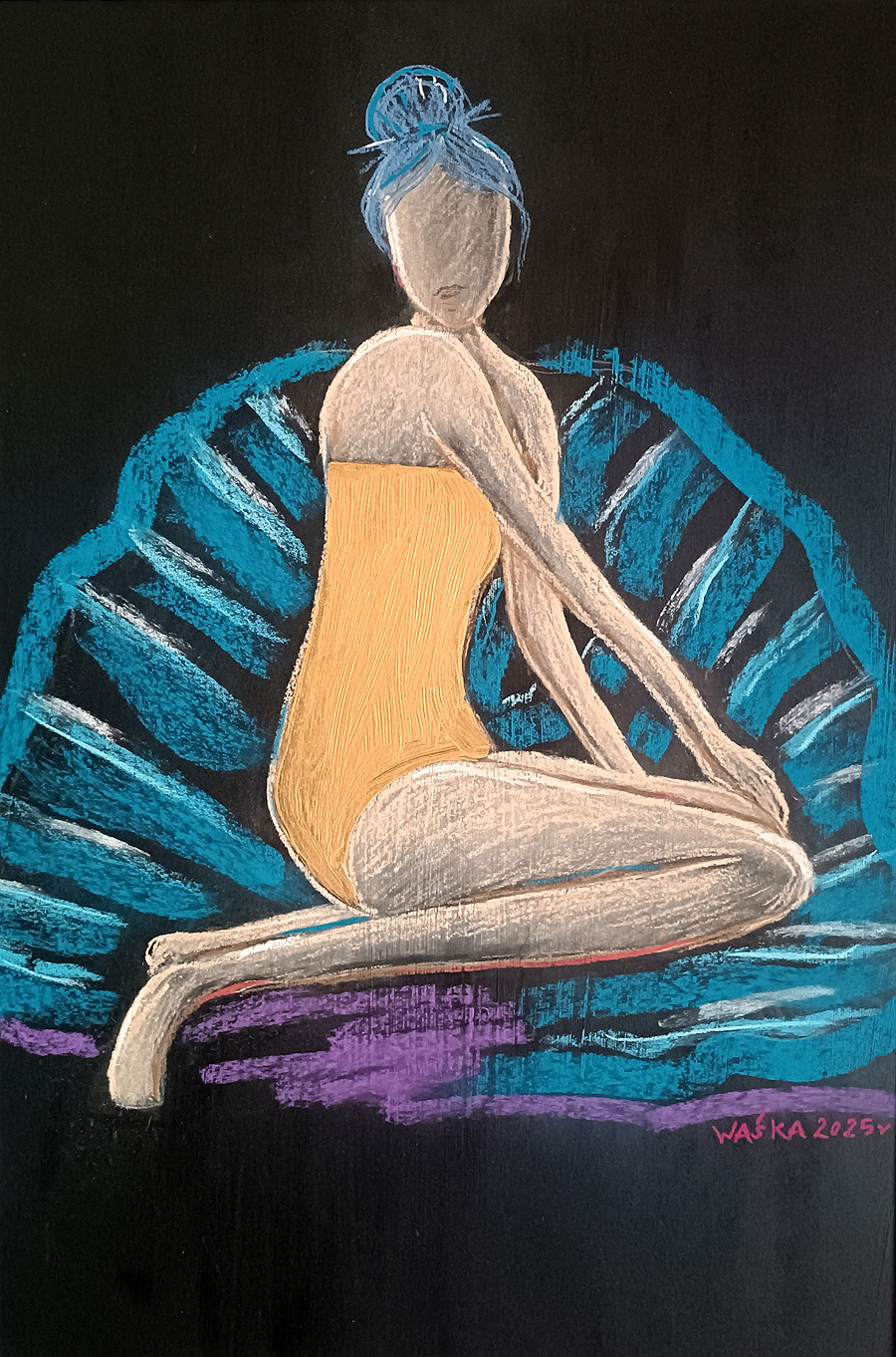 Obraz przedstawia postać siedzącą, otoczoną kompozycją barw, które od razu przyciągają uwagę. Dominującym kolorem jest niebieski oraz złoty strój tancerki , malowany farbą akrylową, kontrastujący z ciemnym tłem. Wzrok przyciągają także niebieskie i fioletowe elementy w tle, które tworzą jakby muszlę czy wachlarz. Kształty są wyraźnie zarysowane, a linie delikatnie podkreślają smukłą sylwetkę postaci. Praca emanuje spokojem, jakby zatrzymanym momentem ciszy