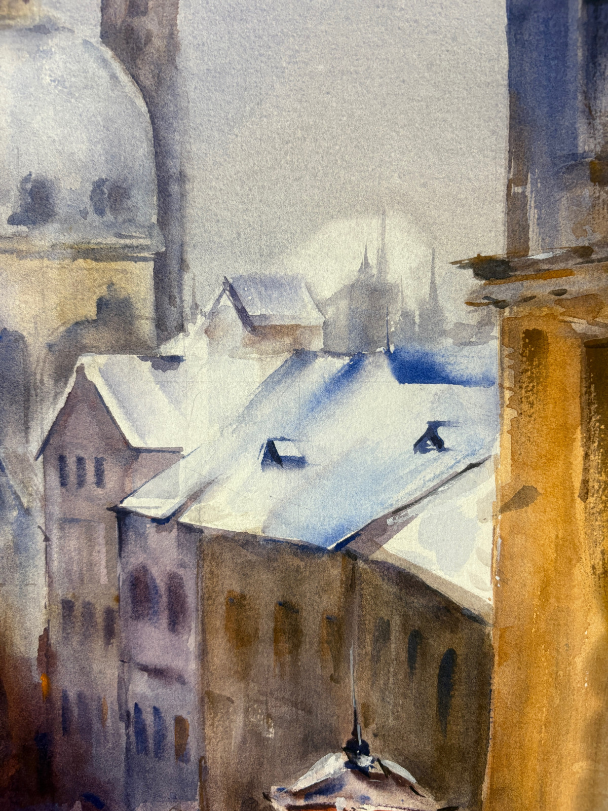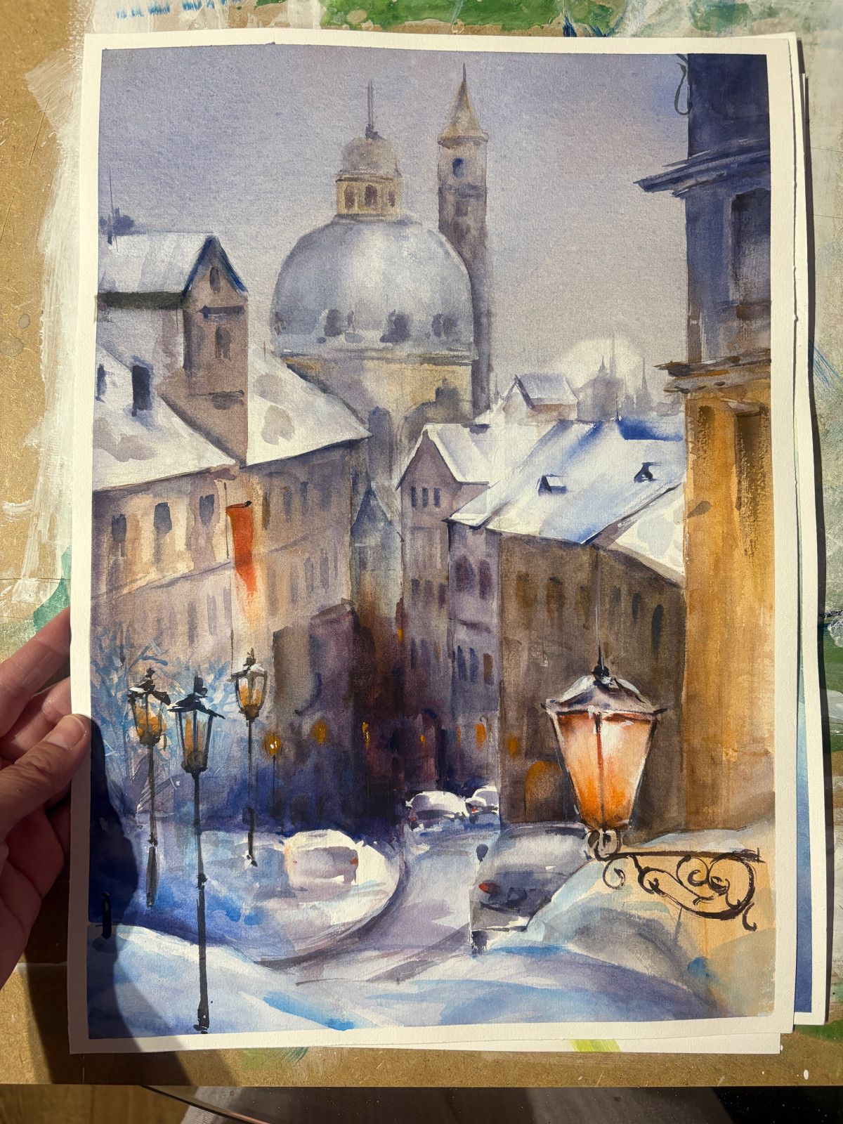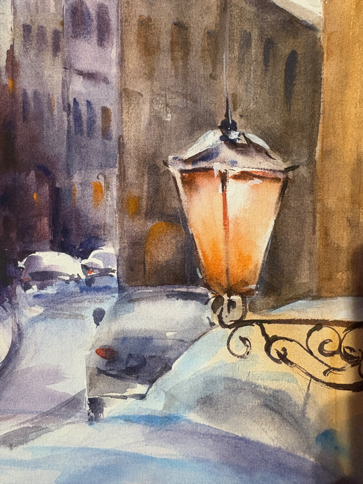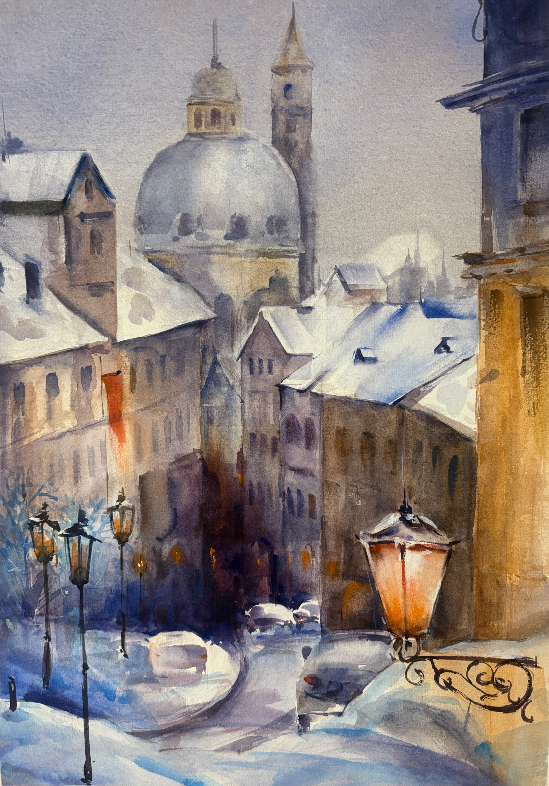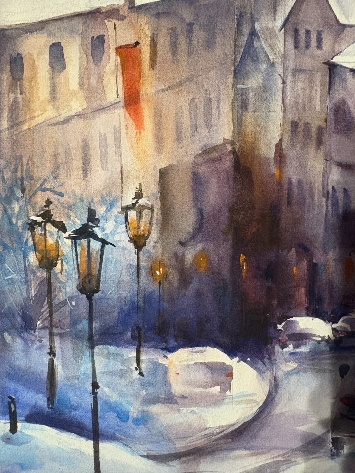 Akwarela przedstawiająca praską uliczkę zimowym wieczorem.