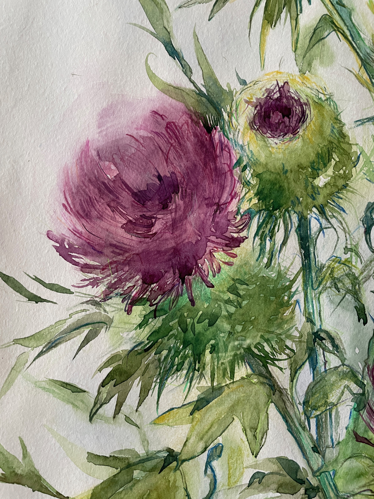 Wiosenny, pełen barw obraz akwarelowy przedstawiający oset, z subtelnymi detalami wykonanymi ołówkiem. Format A2 (42cm x 60 cm)