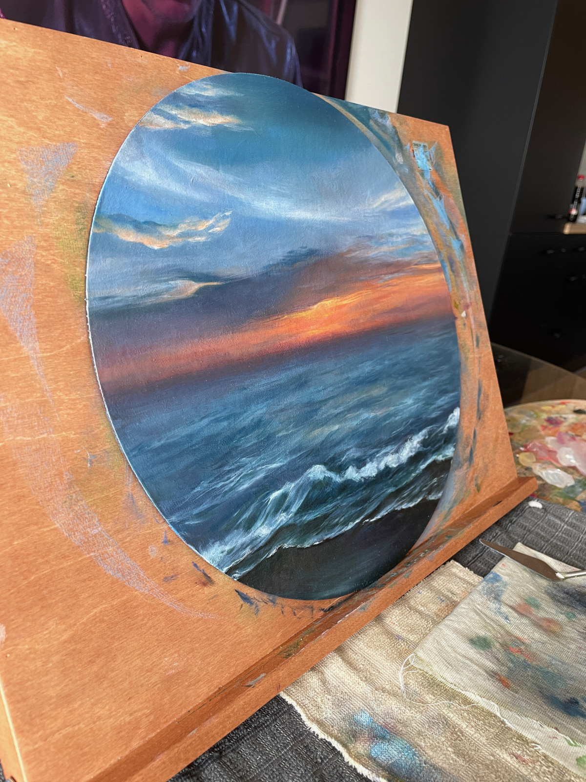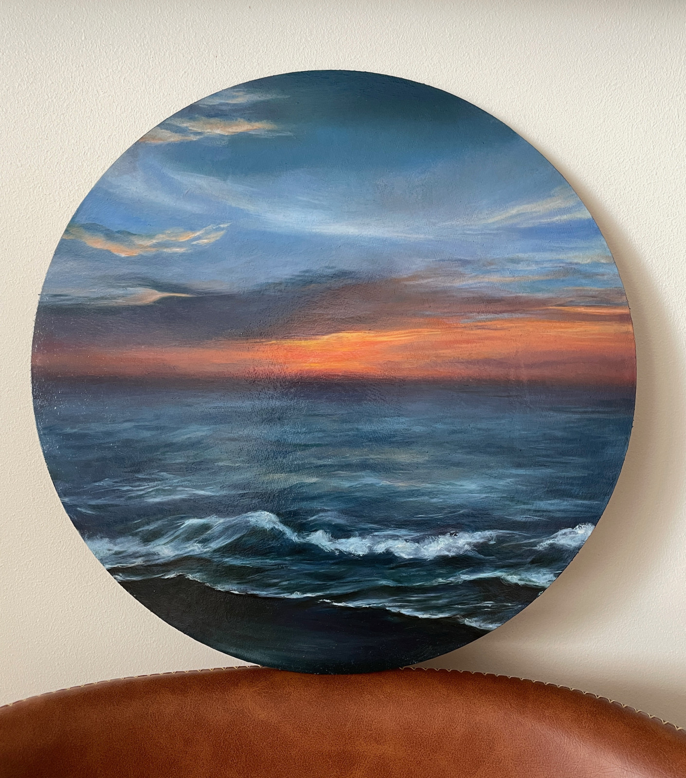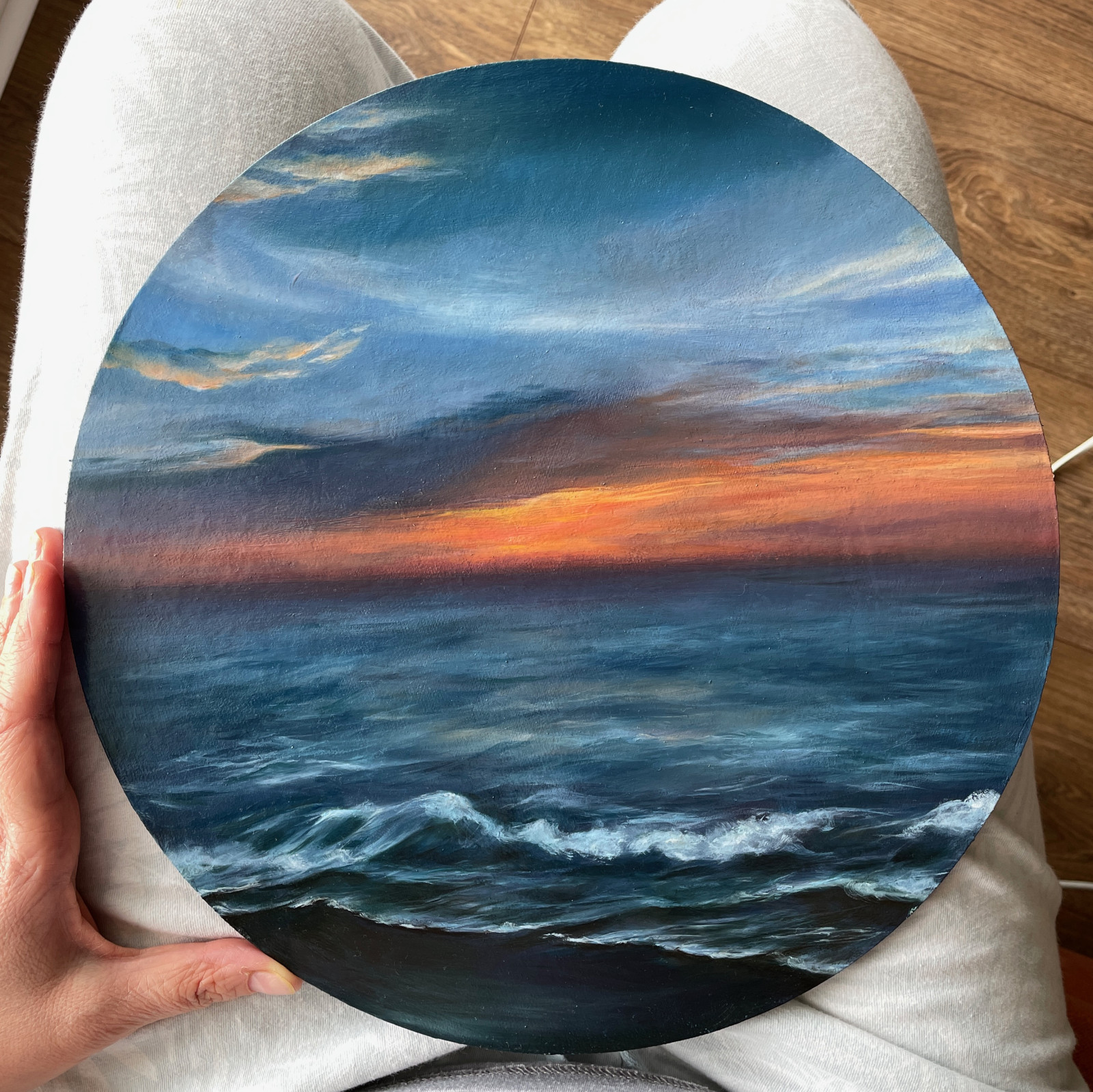 Obraz olejny, wykonany na płycie malarskiej, średnica 30 cm.