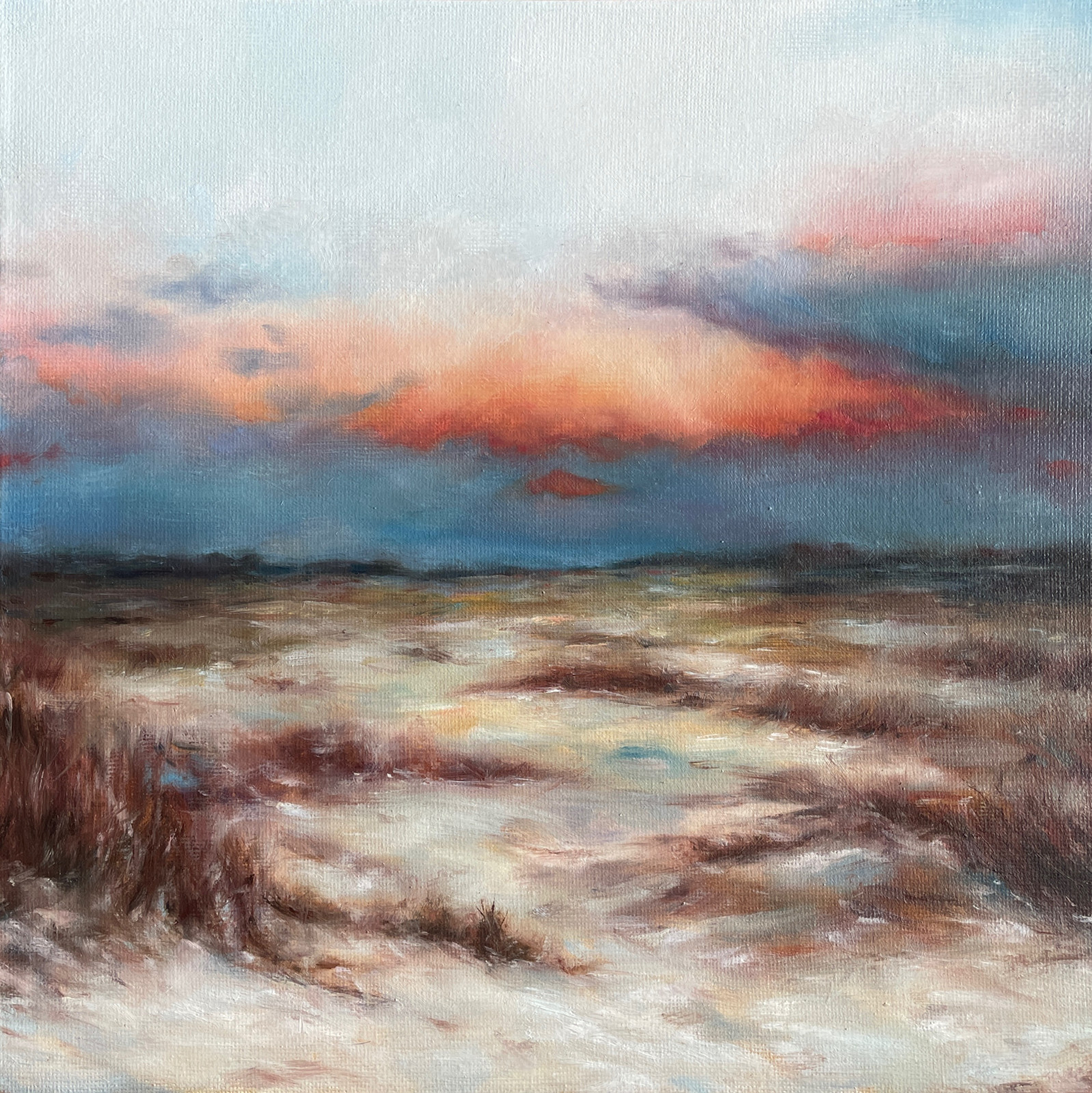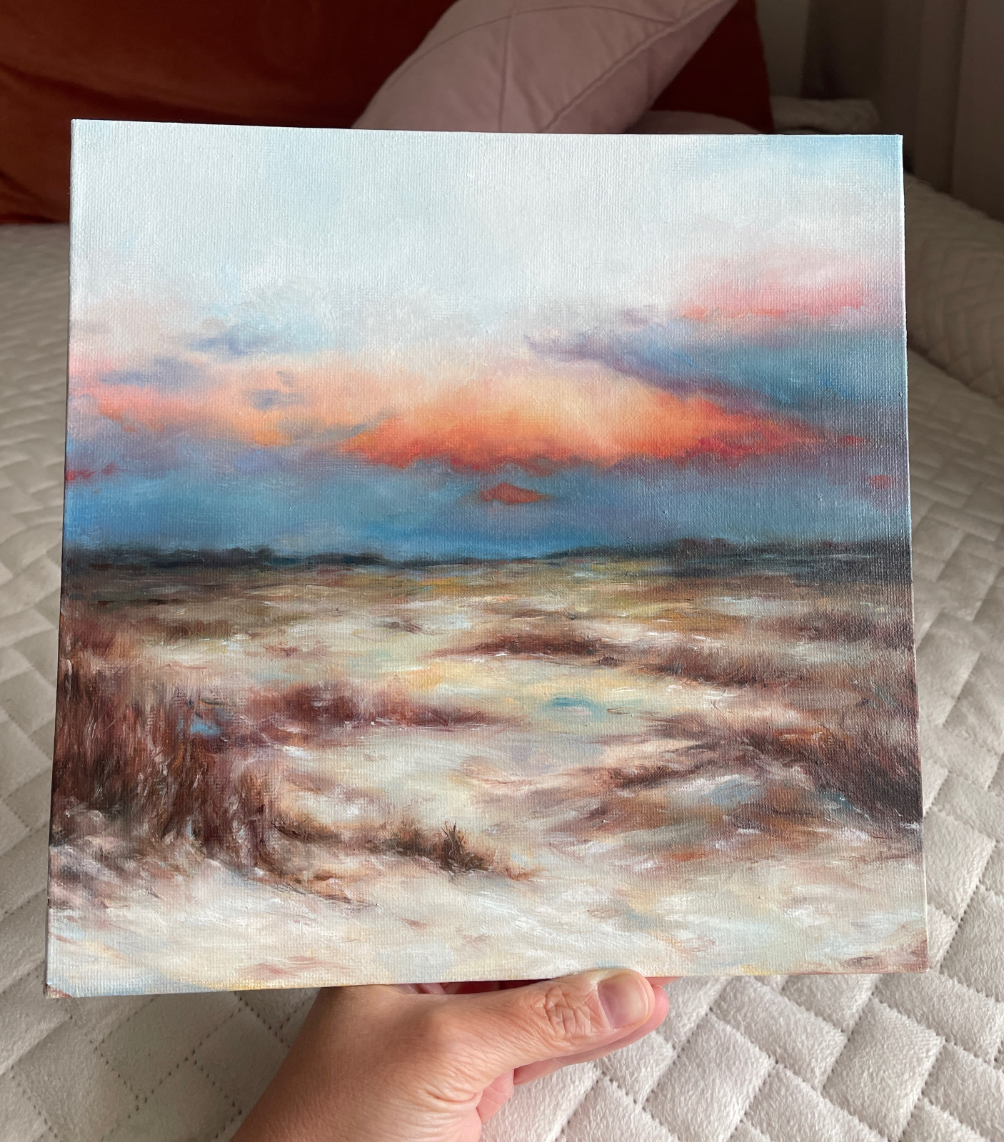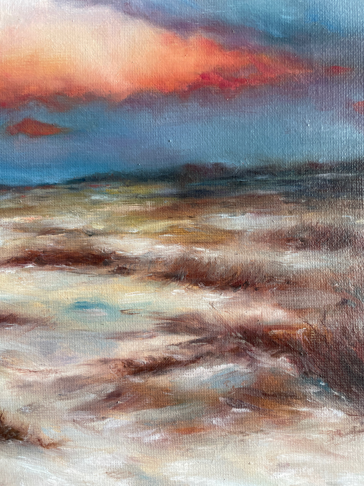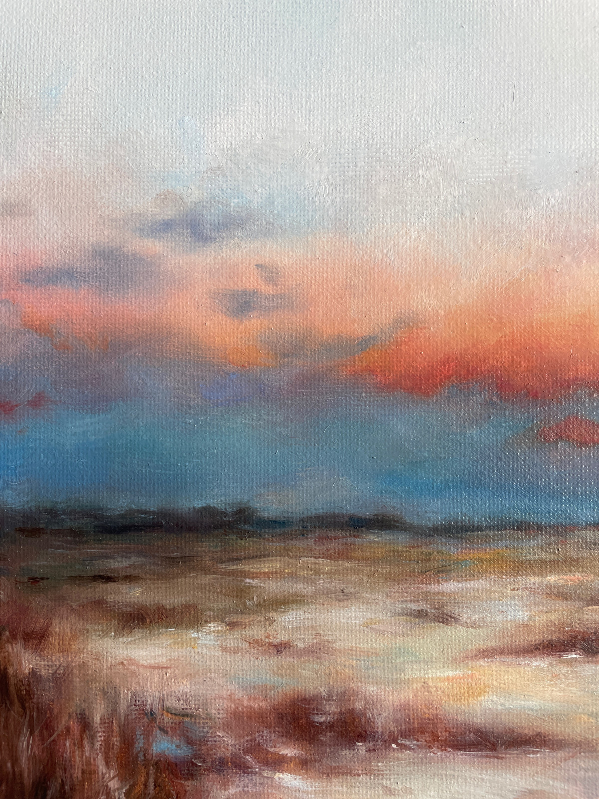 Obraz olejny „Pole” przedstawia spokojny krajobraz.