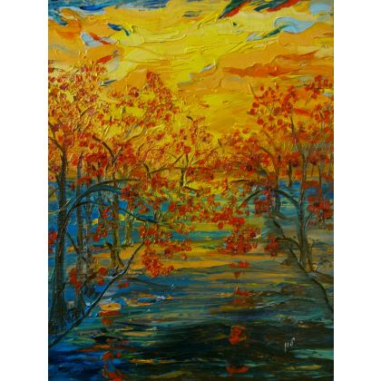 Abstarkcyjny zachod slonca w parku,malowany farbami olejnymi na tablicy malarskiej o wymiarach 35x28 cm,obraz malowany szpachelka,sygnowany,wymaga ramy