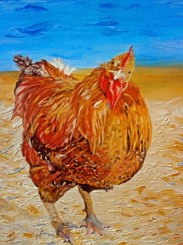 obraz olejny kury domowej na pastwisku,namalowany na tablicy malarskiej o wymiarach 35x28cm,sygnowany
