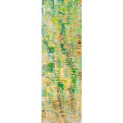 Abstrakcja przepełniona odcieniami zieleni i złota, ale zauważyć możemy na niej również nieco bieli i brązu. Do jej namalowania użyto metalicznego złotego akrylu, który przepięknie się błyszczy w zależności od kąta padania światła. Nadaje to wielowymiarowości abstrakcji oraz przywołuje na myśl tytułowe Przebłyski wiosny. Patrząc na dzieło widzimy jak ta wiosna się zbliża, czuć zapach przebudzającej się do życia przyrody i promienie wiosennego słońca. Dzieło jest sygnowane z tyłu: Mariola Świgulska Senna 2022, co daje kupującemu dowolność jeśli chodzi o to w jaką stronę ma być powieszona na ścianie abstrakcja, w pionie czy w poziomie. Obraz będzie idealnym prezentem dla osoby kochającej abstrakcję oraz przyrodę. Praca ma wymiary 120x40x1 cm. Idealnie wkomponowałaby się w nowoczesne minimalistyczne wnętrze oświetlając je swoim błyskiem.