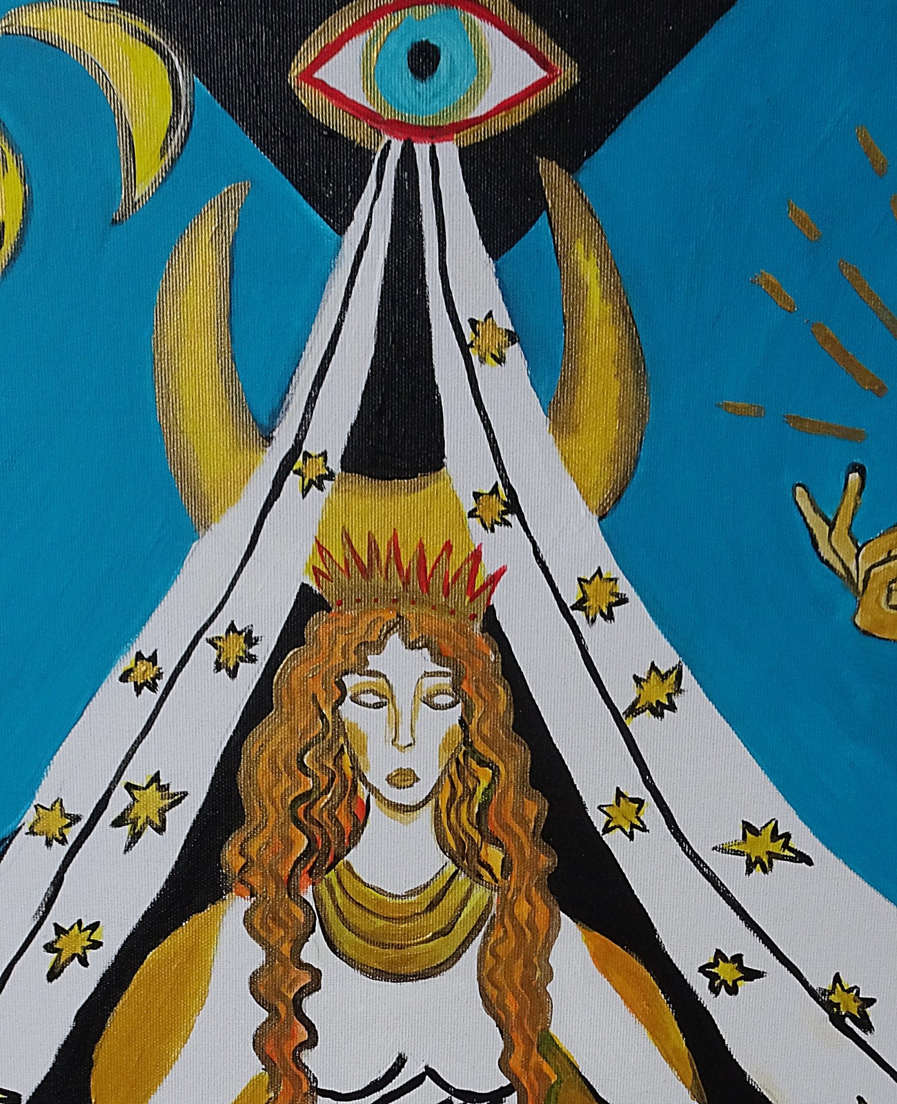 Obraz namalowany techniką olejną na blejtramie o wymiarach: 100/70 cm, boki obrazu zamalowane, sygnowany z przodu. Jest to moja autorska kompozycja inspirowana kartami tarota. Świetnie może być eksponowany w nowoczesnych wnętrzach o stonowanej kolorystyce. Swoimi barwami może rozjaśnić takie wnętrza, w oświetleniu dziennym, jak i sztucznym. Polecany dla miłośników ekspresji i nie tylko tarota.