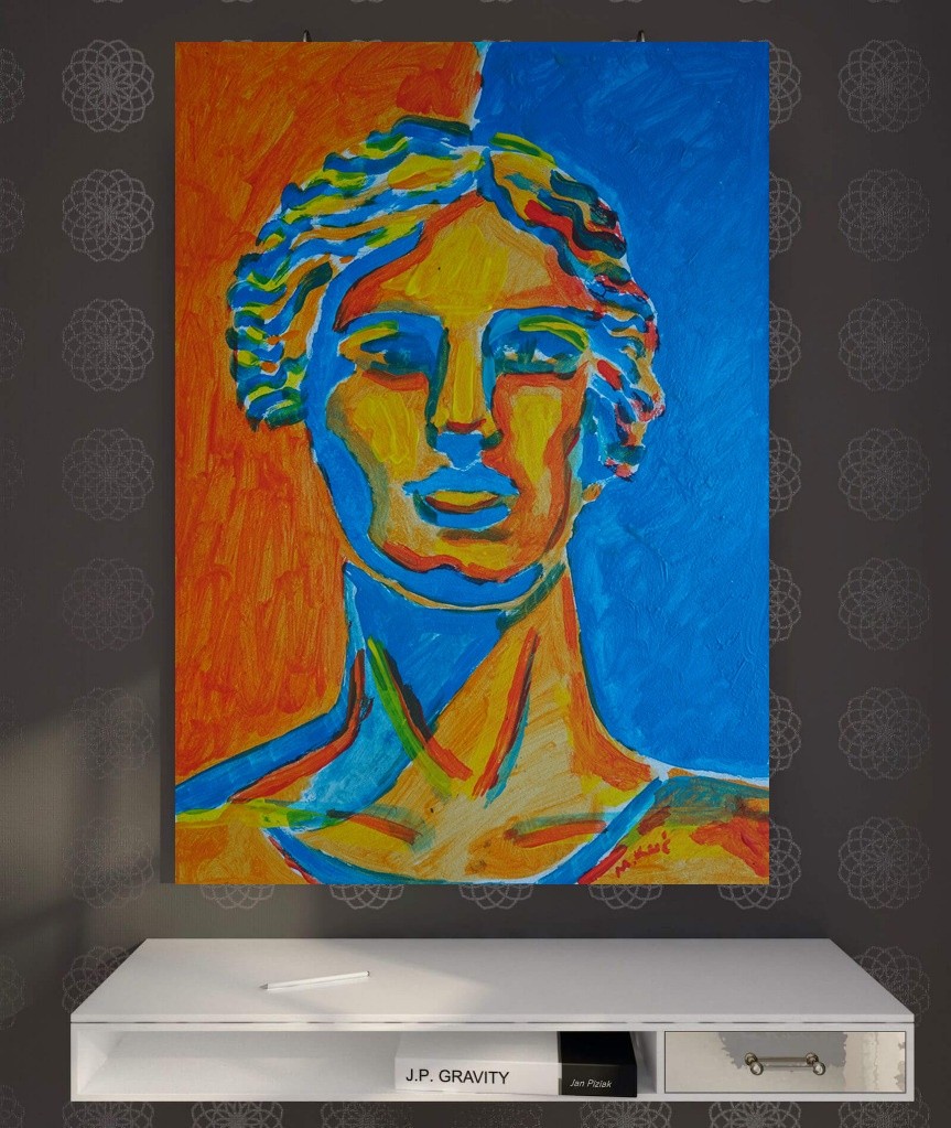 Jest to moja autorska kompozycja. Świetnie może być eksponowany w nowoczesnych wnętrzach o stonowanej kolorystyce. Swoimi barwami może rozjaśnić takie wnętrza, w oświetleniu dziennym, jak i sztucznym.