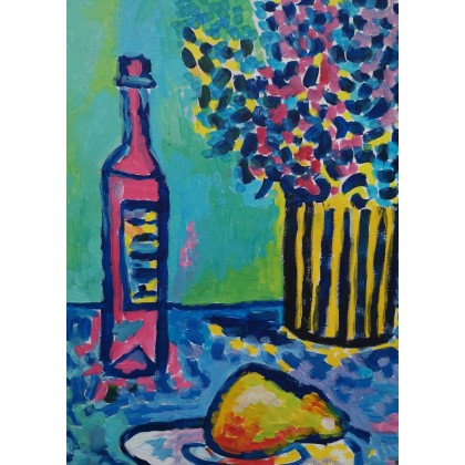 Obraz namalowany olejami na płycie o wymiarach:30/40 cm, sygnowany z przodu. Jest to moja autorska kompozycja. Świetnie może być eksponowany w nowoczesnych wnętrzach o stonowanej kolorystyce. Swoimi barwami może rozjaśnić takie wnętrza, w oświetleniu dziennym, jak i sztucznym.