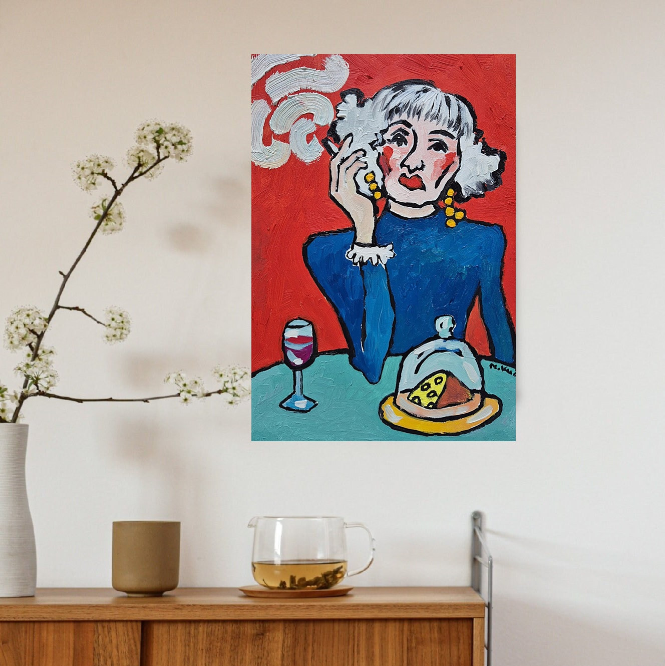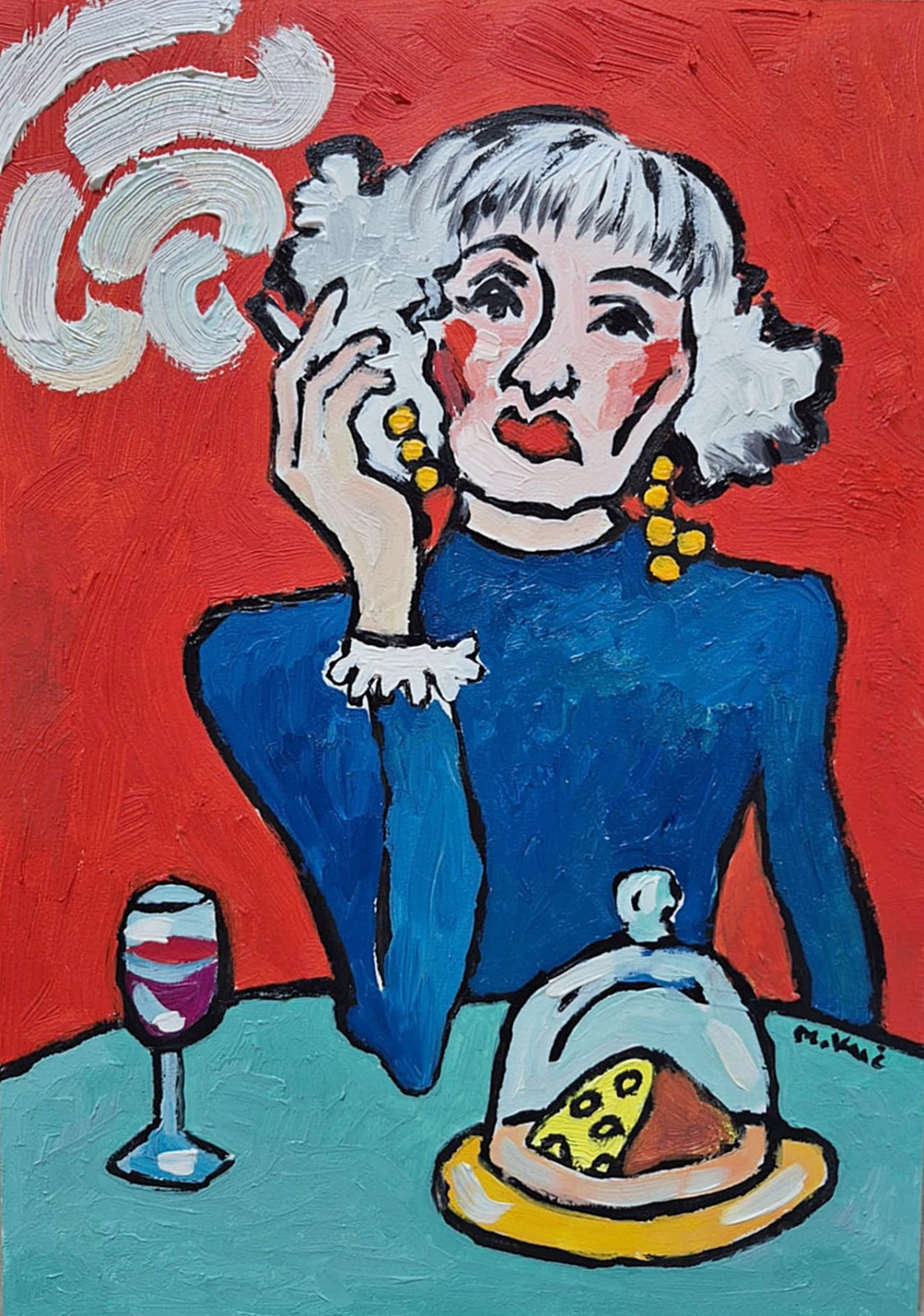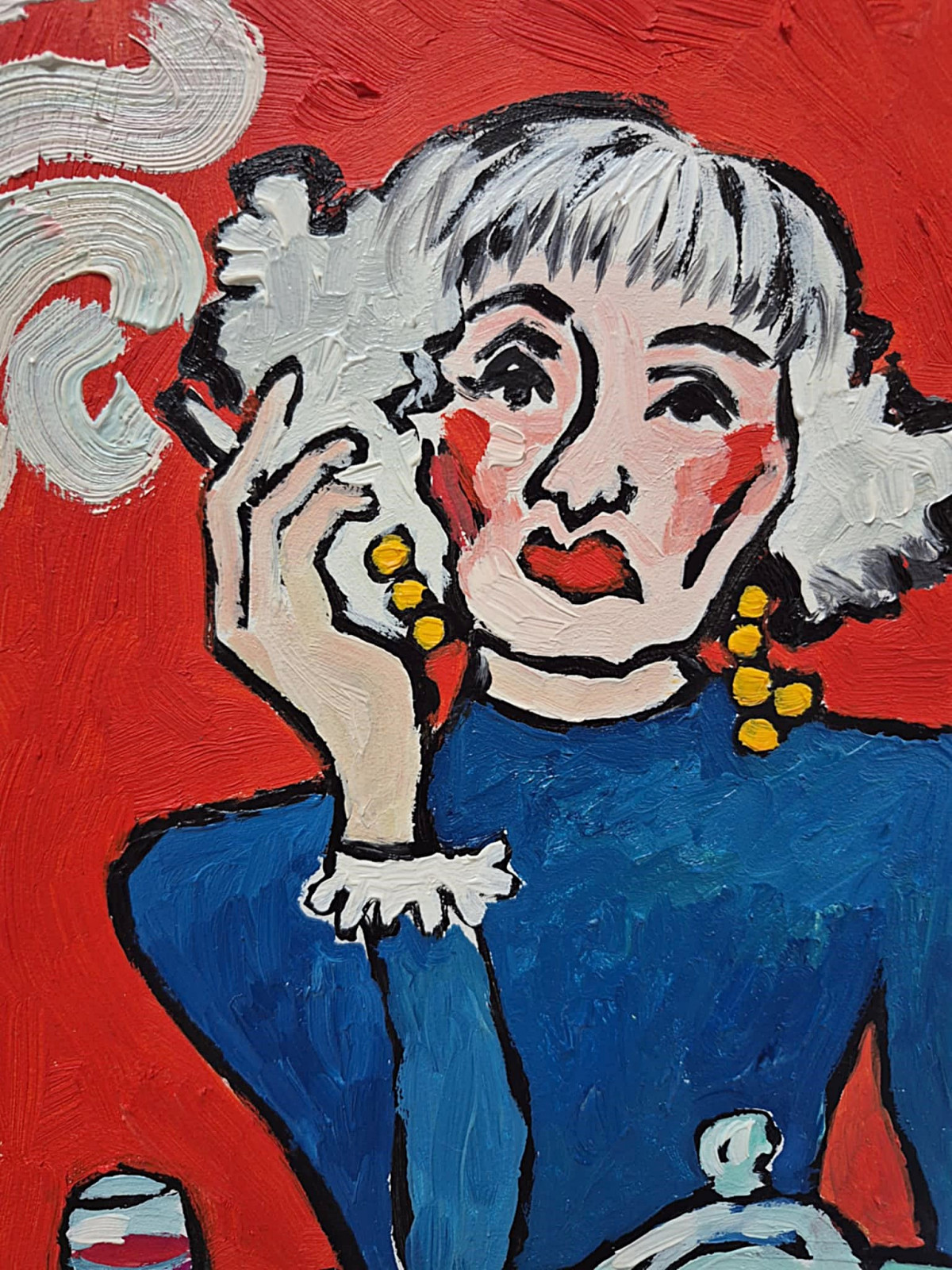 Na tle intensywnej, niemal krzyczącej czerwieni siedzi kobieta jak wycięta z własnych myśli. Ma twarz zbudowaną z grubych, zdecydowanych pociągnięć pędzla — trochę surową, trochę czułą. Jej spojrzenie nie szuka kontaktu z widzem jest gdzieś obok, może w przeszłości, może w planach na później. Białe włosy układają się jak chmury, a dym, który unosi się z papierosa, zdaje się być ich przedłużeniem — myślą, która nie chce zostać wypowiedziana.