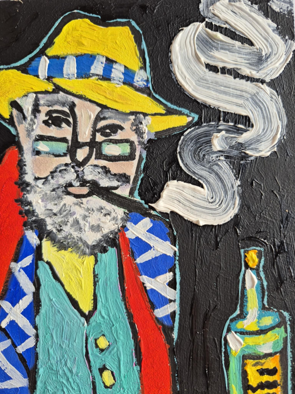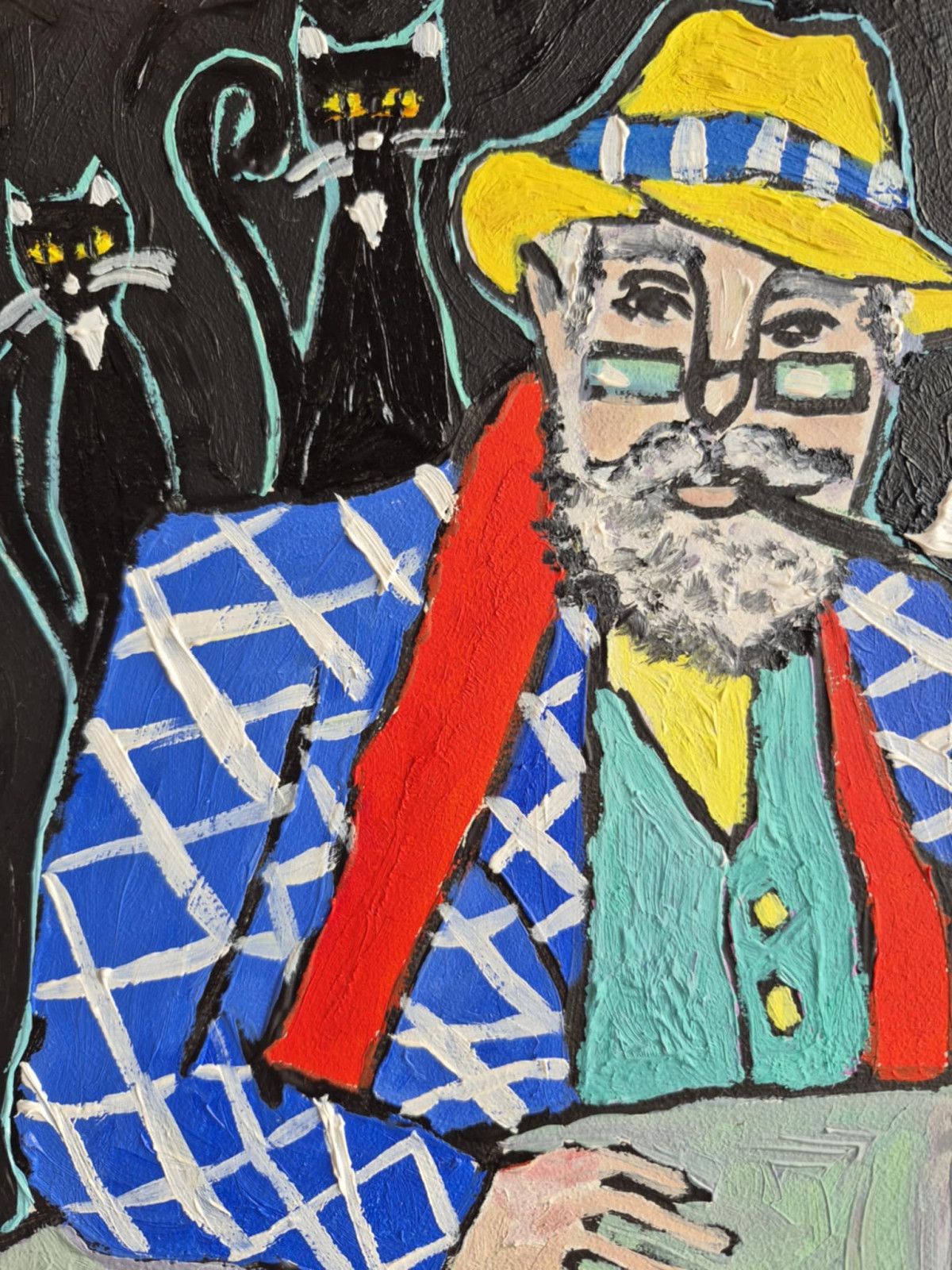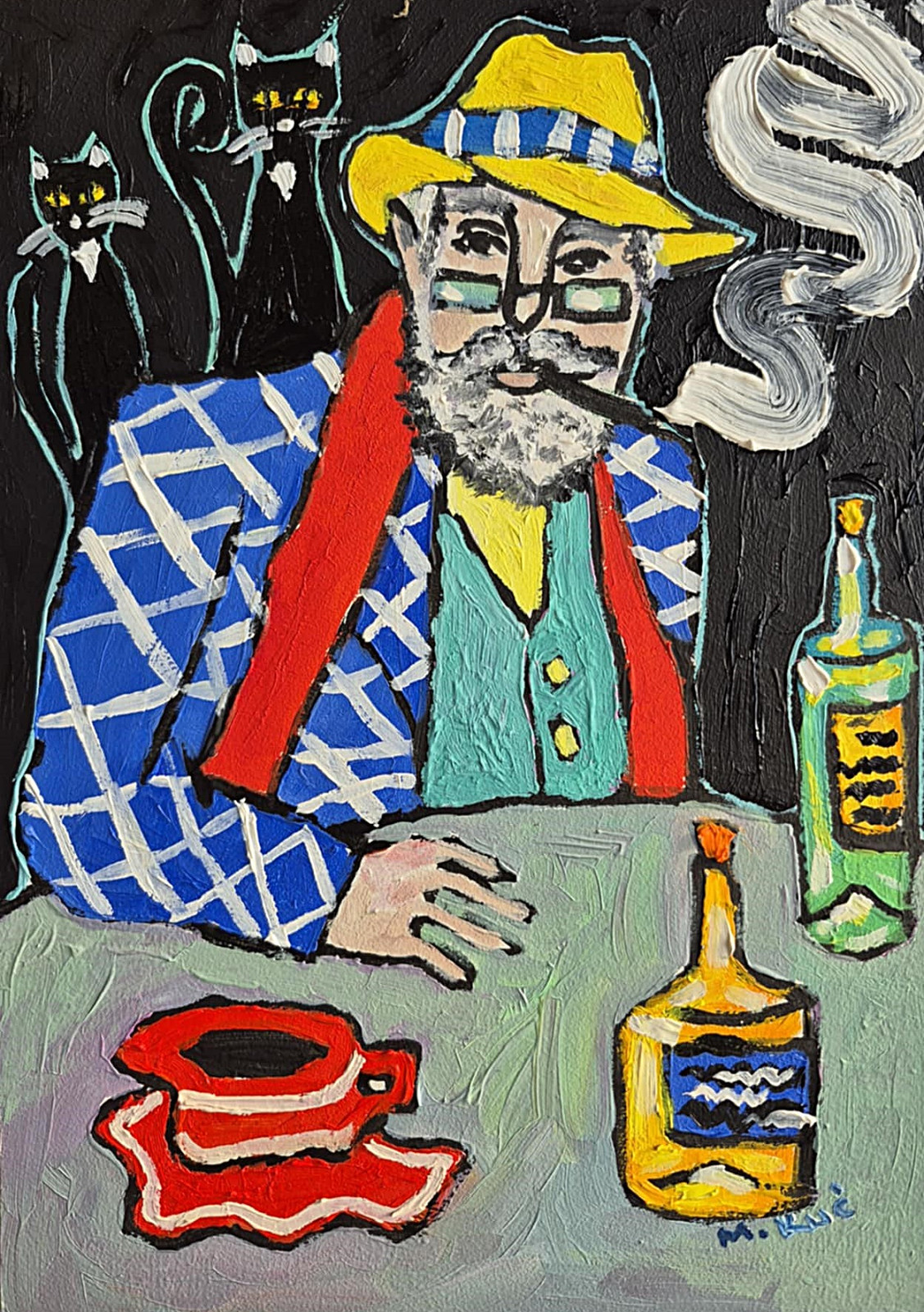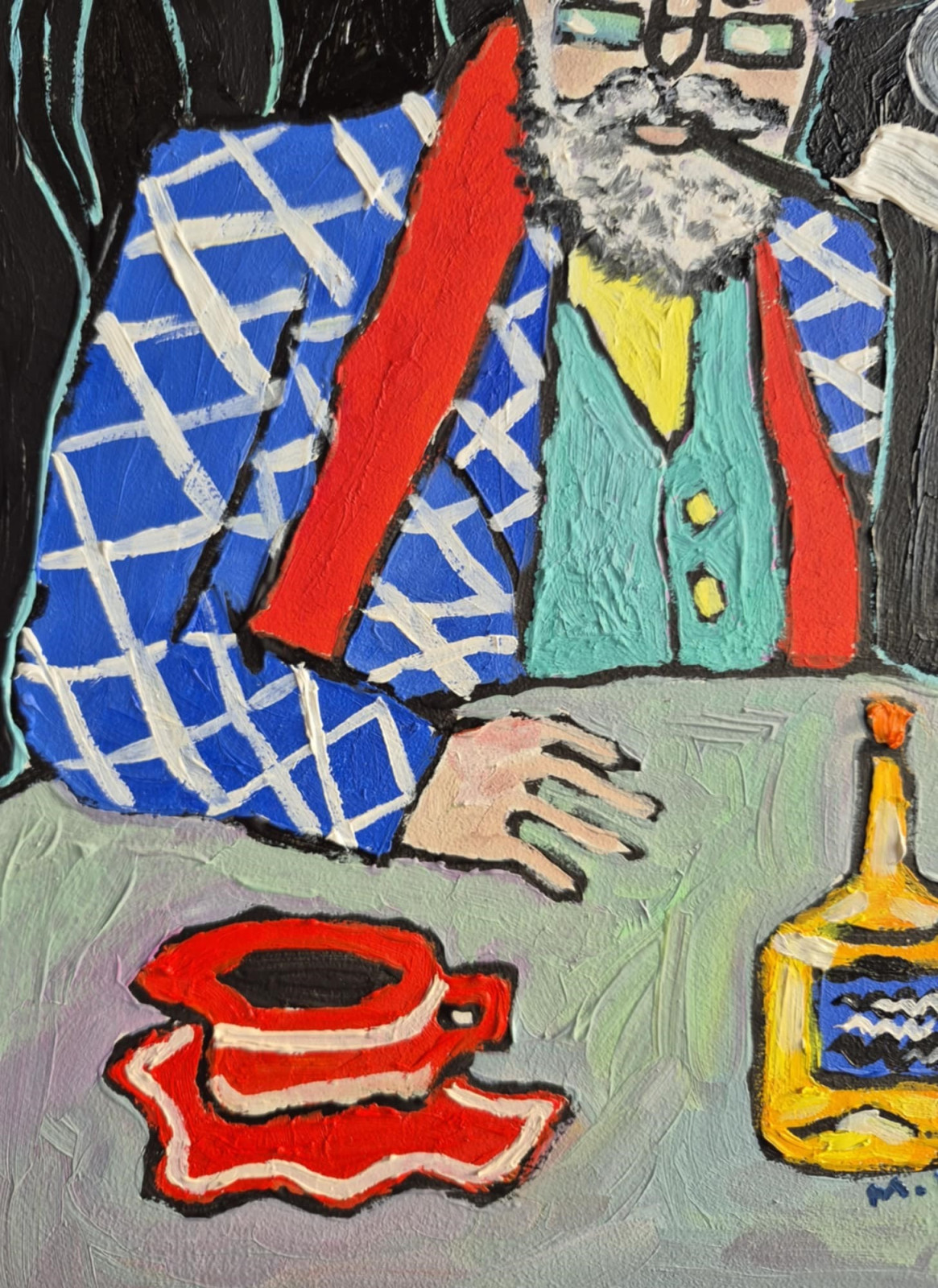 To obraz o wyraźnie ekspresyjnym, niemal naiwnym charakterze, w którym forma podporządkowana jest nastrojowi, a nie realizmowi. Centralną postacią jest mężczyzna siedzący przy stole — brodaty, w kapeluszu o żółtej barwie, z okularami zsuniętymi nisko na nos. Jego twarz jest spokojna, zamyślona, jakby zawieszona między codziennością a wewnętrzną opowieścią