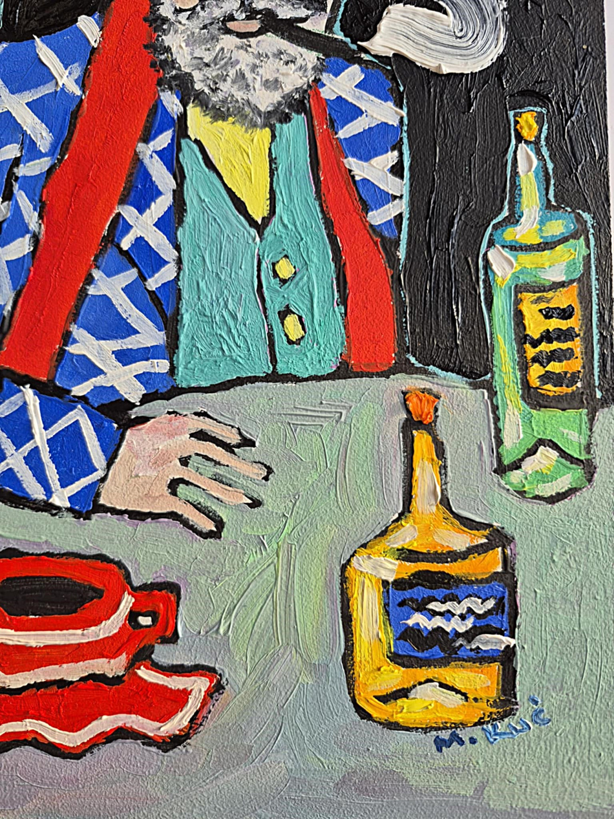 Na stole leżą przedmioty codzienne: filiżanka, butelki alkoholu. Nie są one jednak realistyczne — uproszczone, ciężkie od farby, stają się znakami: samotności, rytuału, może ucieczki. Dym unoszący się z papierosa rysuje się grubą, białą smugą na czarnym tle, jak materializacja myśli lub wspomnień.