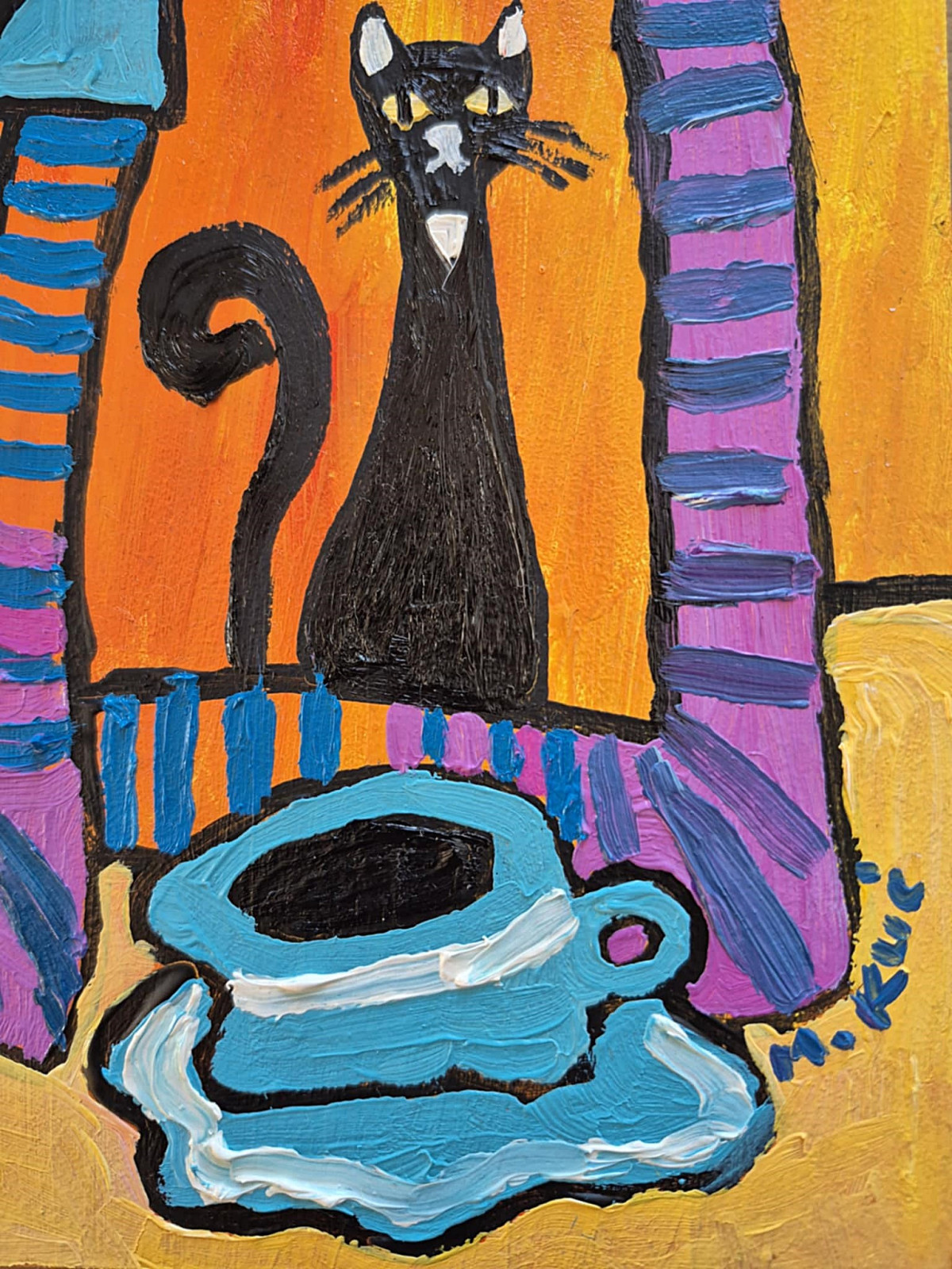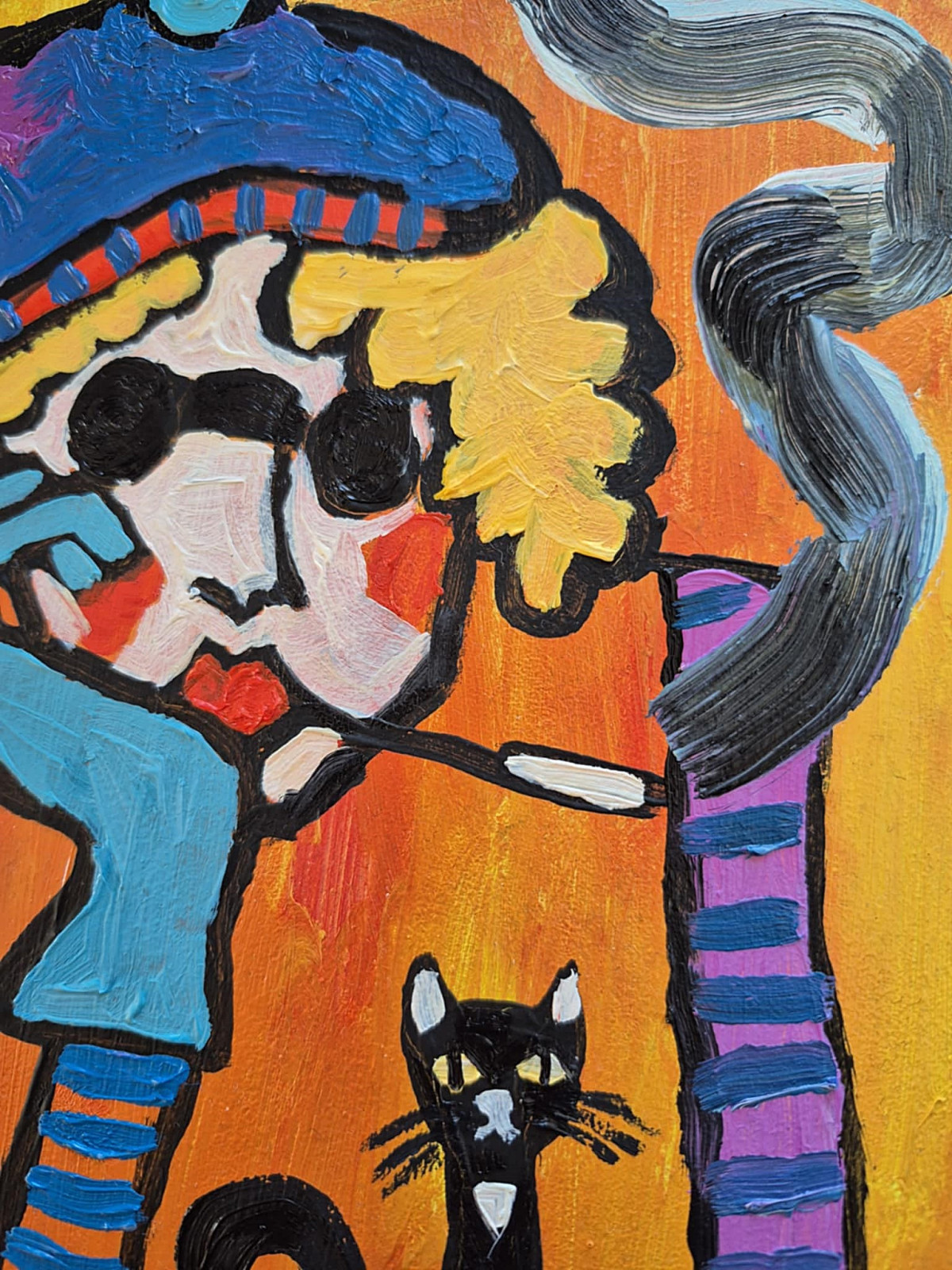Kolor gra tu rolę emocji, nie dekoracji. Pomarańczowe tło pali się jak wieczór po zbyt długim dniu, kontrastując z zimnymi błękitami dłoni i filiżanki. Fioletowo-niebieskie pasy na rękach przypominają zarówno piżamę, jak i strój klauna – balansując między intymnością a groteską. Gruba, wyraźna linia konturu zamyka formy, jakby artysta chciał zatrzymać chaos w ryzach.