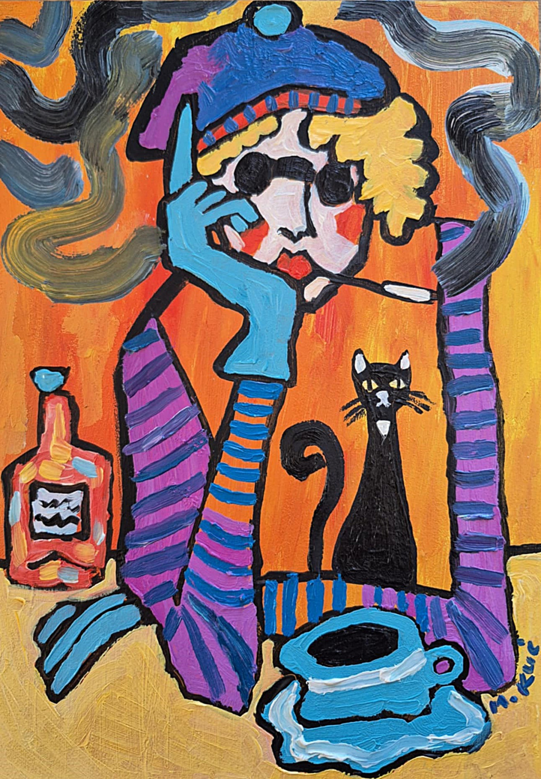 Czarny kot – cichy obserwator – siedzi obok niczym ego bohatera. Jest czujny, niemal oskarżycielski. Wprowadza motyw samotności, ale też przesądu, nocy, wewnętrznego niepokoju. Butelka z etykietą i parująca filiżanka tworzą martwą naturę na granicy absurdu – symbole ucieczki, rytuału, chwilowego ukojenia.