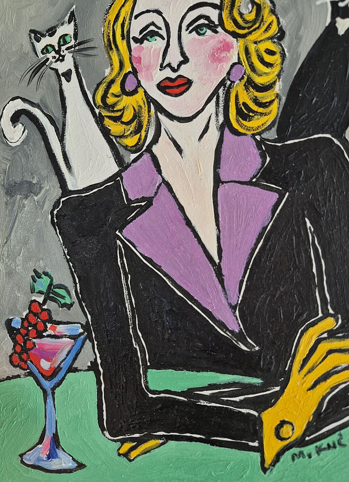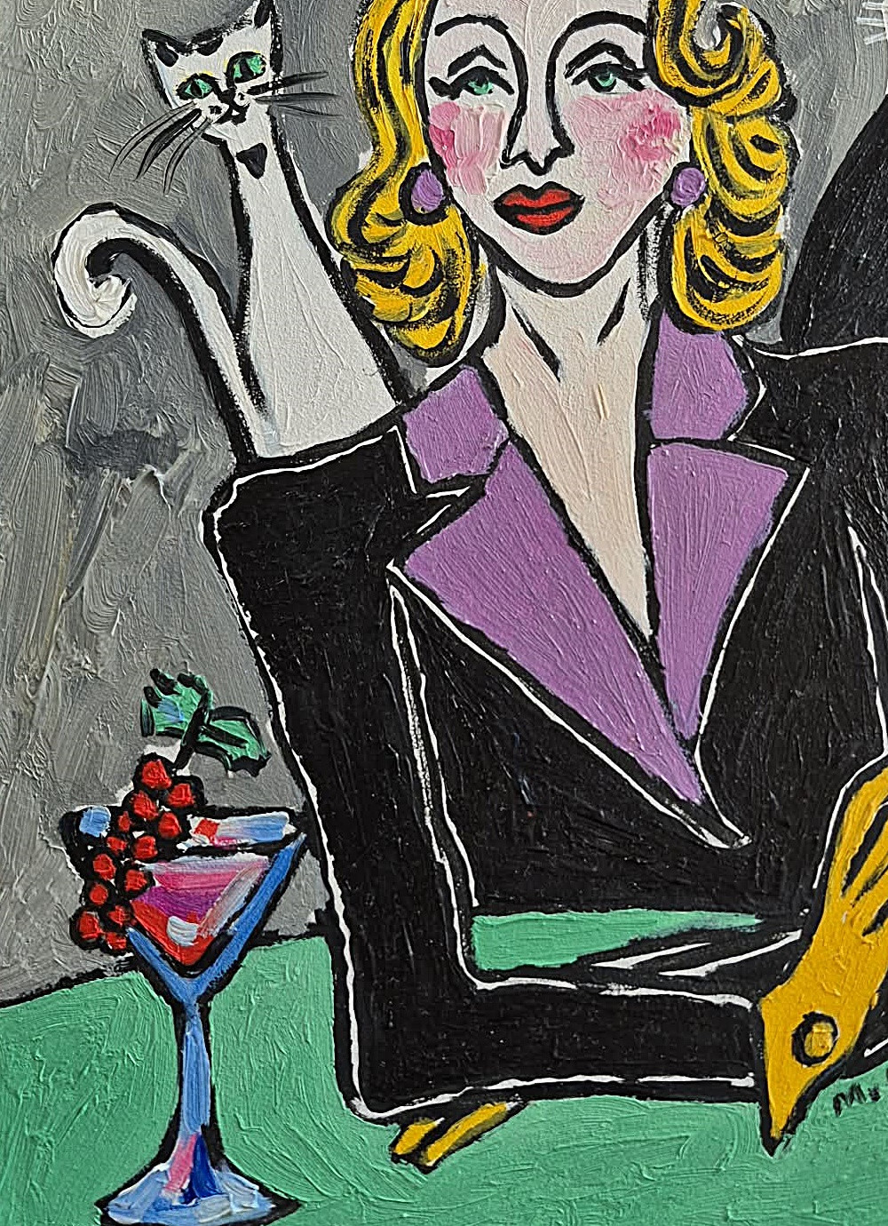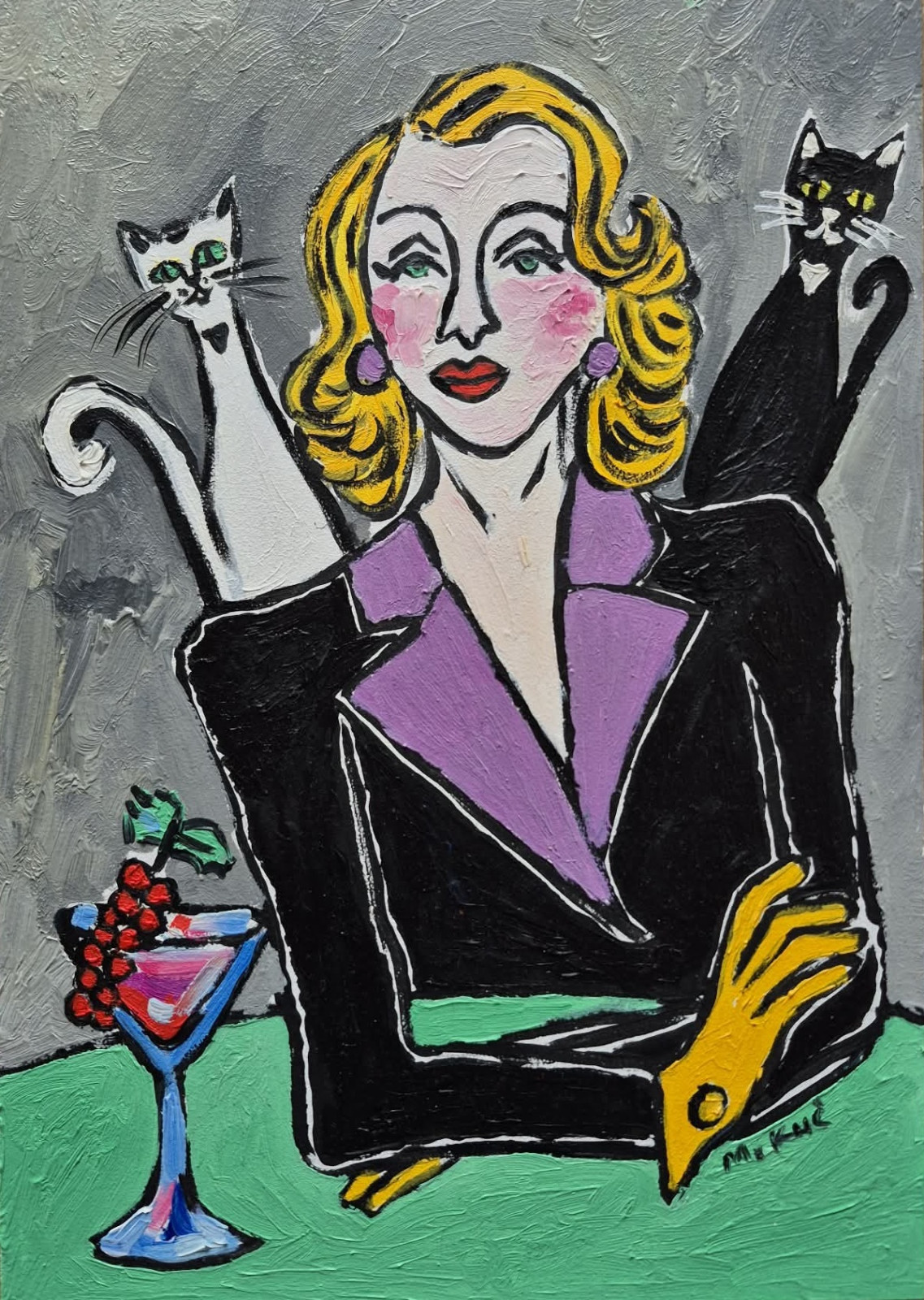Po obu stronach kobiety siedzą dwa koty — biały i czarny — niczym symboliczni strażnicy równowagi. Ich zielone oczy błyszczą tajemniczo, wprowadzając element niepokoju i magii. W dolnym rogu obrazu stoi kieliszek koktajlowy z czerwonym napojem i kiścią winogron, co dodaje scenie nuty luksusu i lekkiej dekadencji.