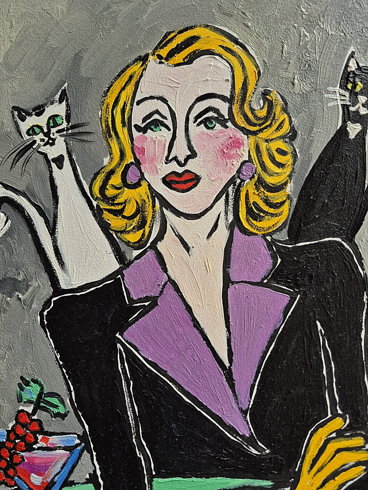 Na obrazie widzimy stylizowany portret kobiety, namalowany grubą, wyrazistą kreską i intensywnymi, kontrastowymi kolorami. Jej twarz jest jasna, niemal porcelanowa, z delikatnym rumieńcem na policzkach i mocno podkreślonymi ustami w odcieniu czerwieni. Zielone oczy patrzą spokojnie, z lekką nutą zadumy, jakby zatrzymane gdzieś pomiędzy rzeczywistością a snem.