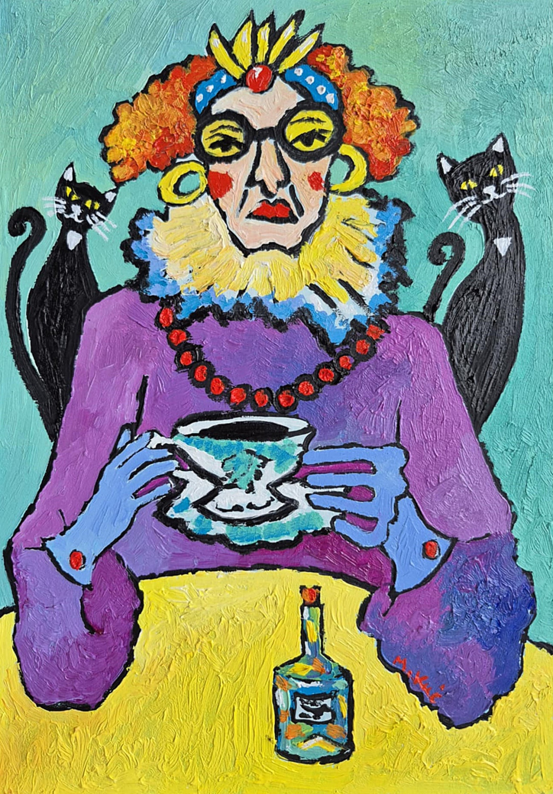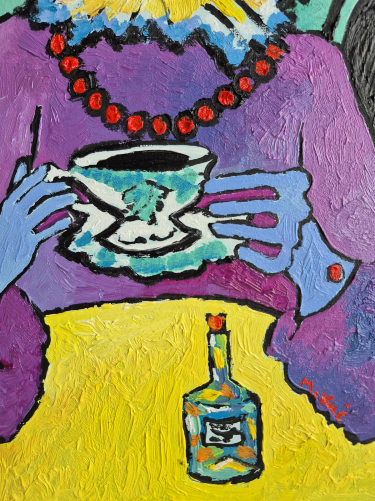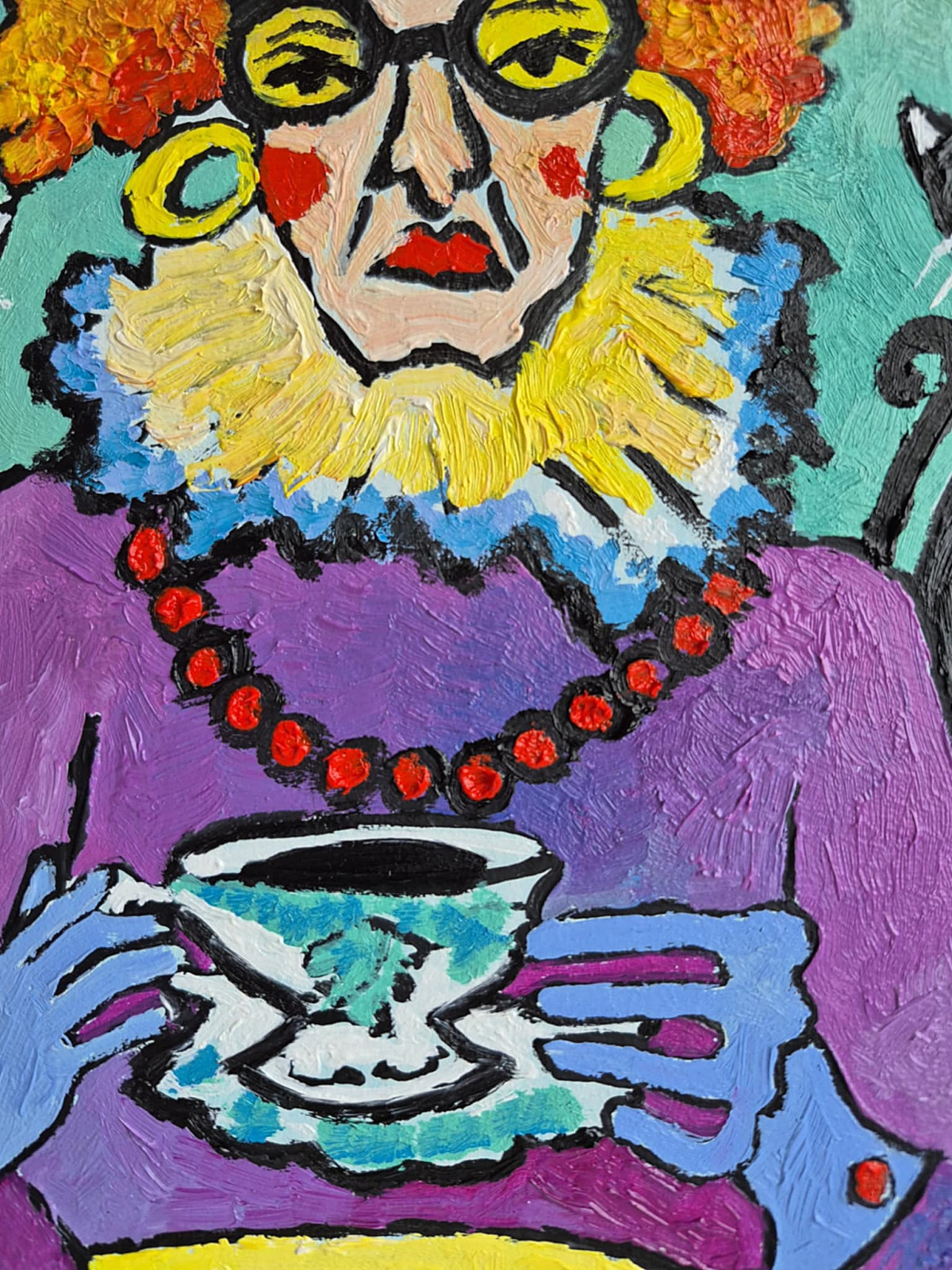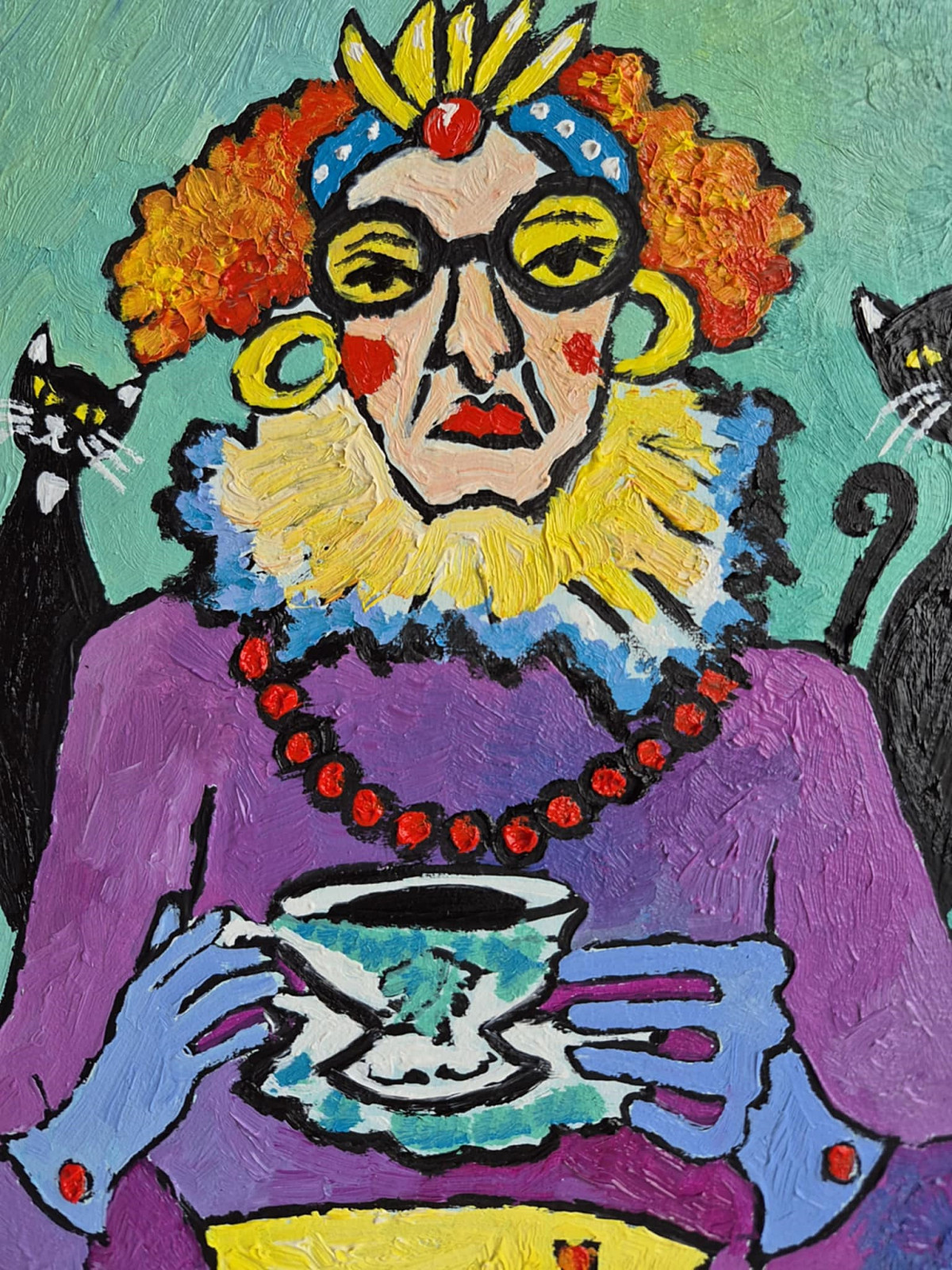 Ten obraz jest jak teatralne przedstawienie — groteskowe, przerysowane, ale pełne charakteru. To portret kobiety, która pije kawę tak, jak inni prowadzą rewolucje: z godnością, przesadą i odrobiną szaleństwa.