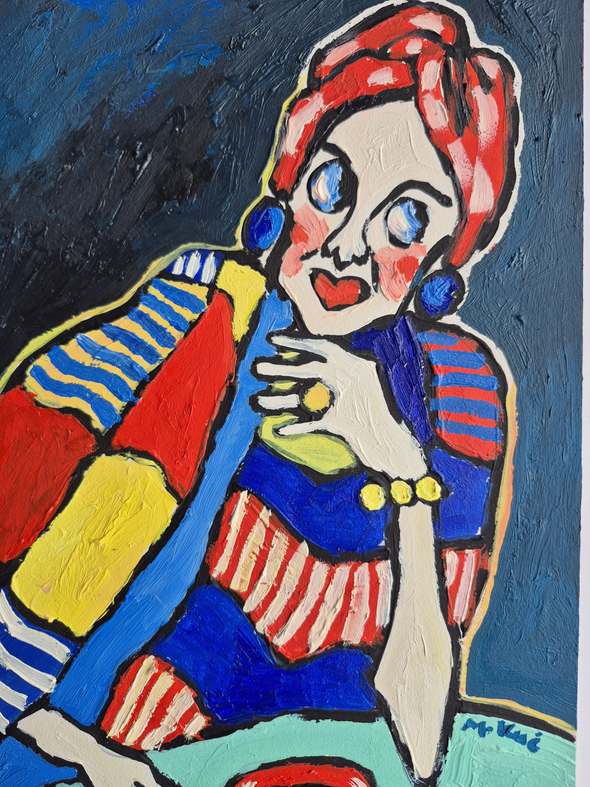 Twarz kobiety jest uproszczona, wręcz deformowana: duże oczy, wyraźnie zaznaczone usta, mocne rumieńce. To nie portret realistyczny, lecz interpretacja – być może bardziej psychologiczna niż fizyczna. Czerwona chusta na głowie i duże, niebieskie kolczyki dodają jej charakteru, przywołując skojarzenia z modą retro albo stylizacją teatralną.