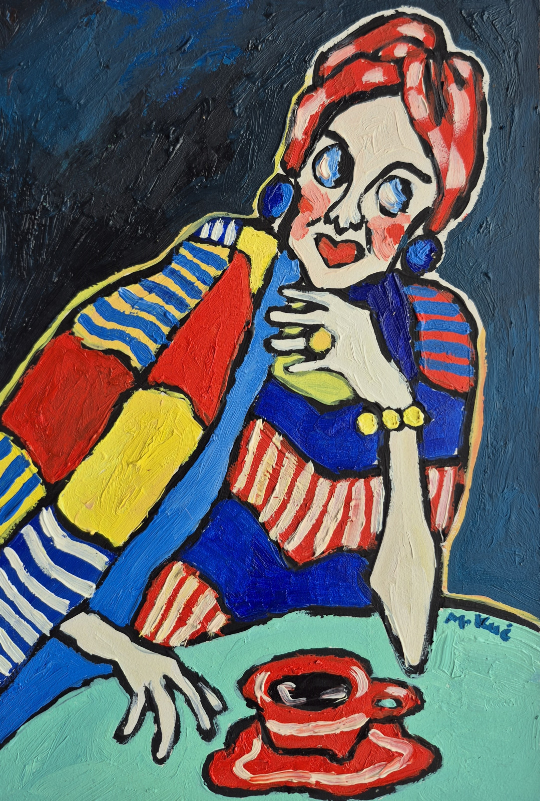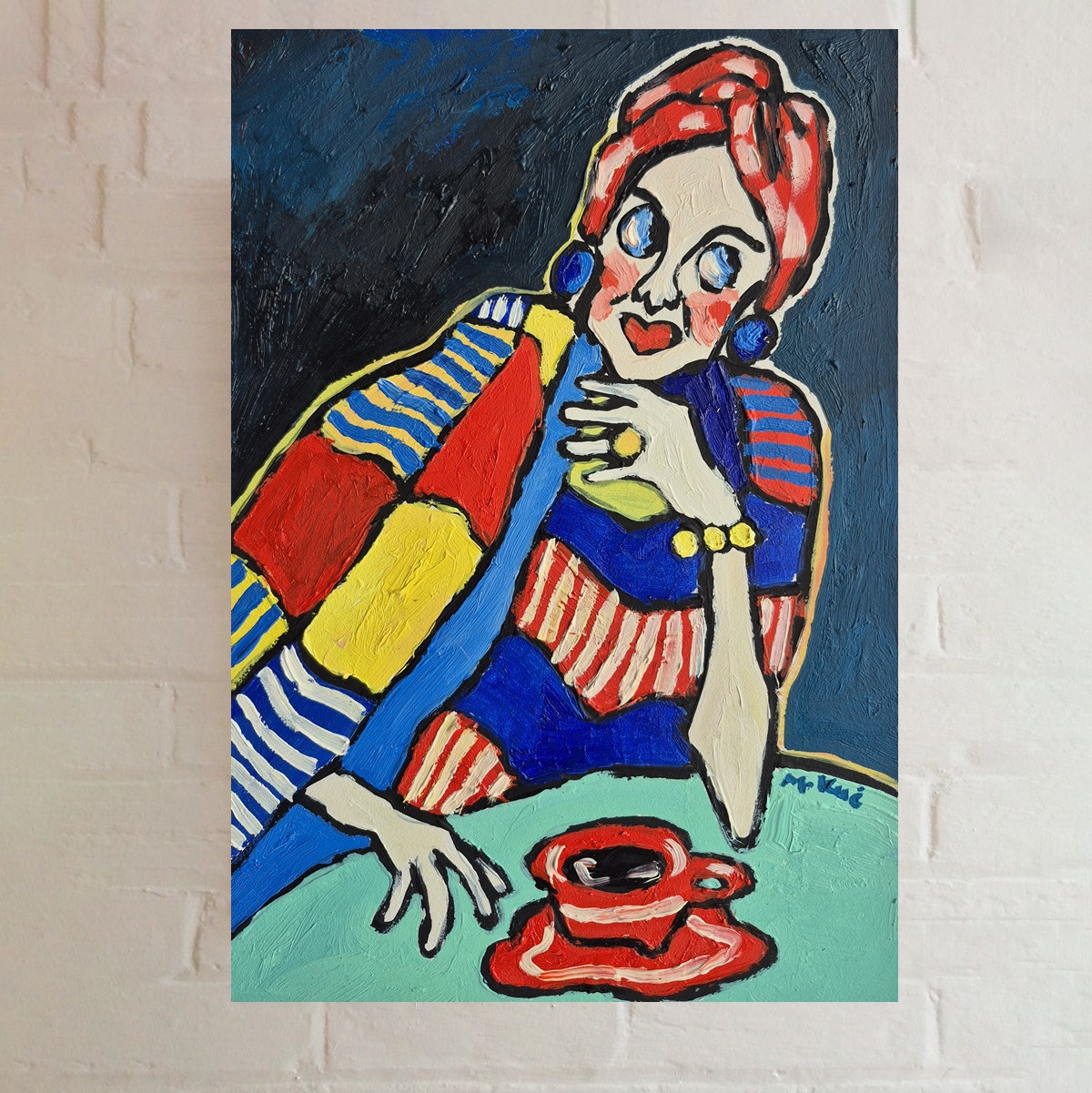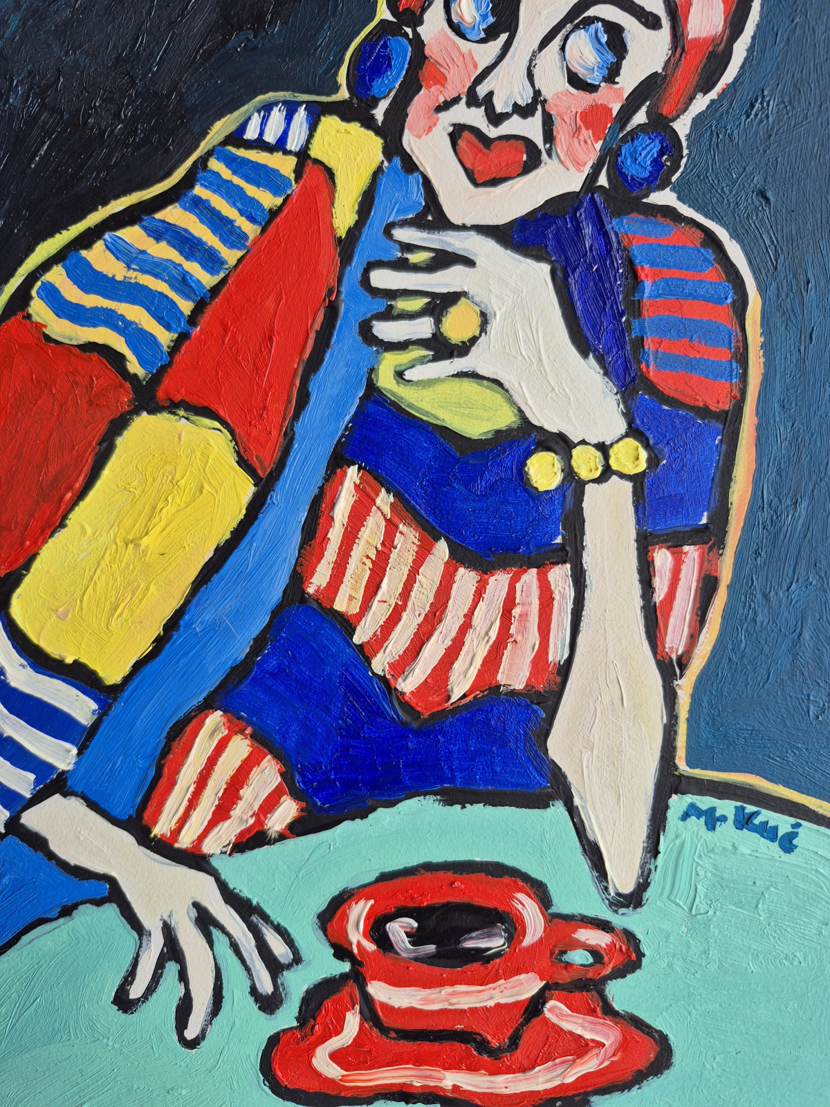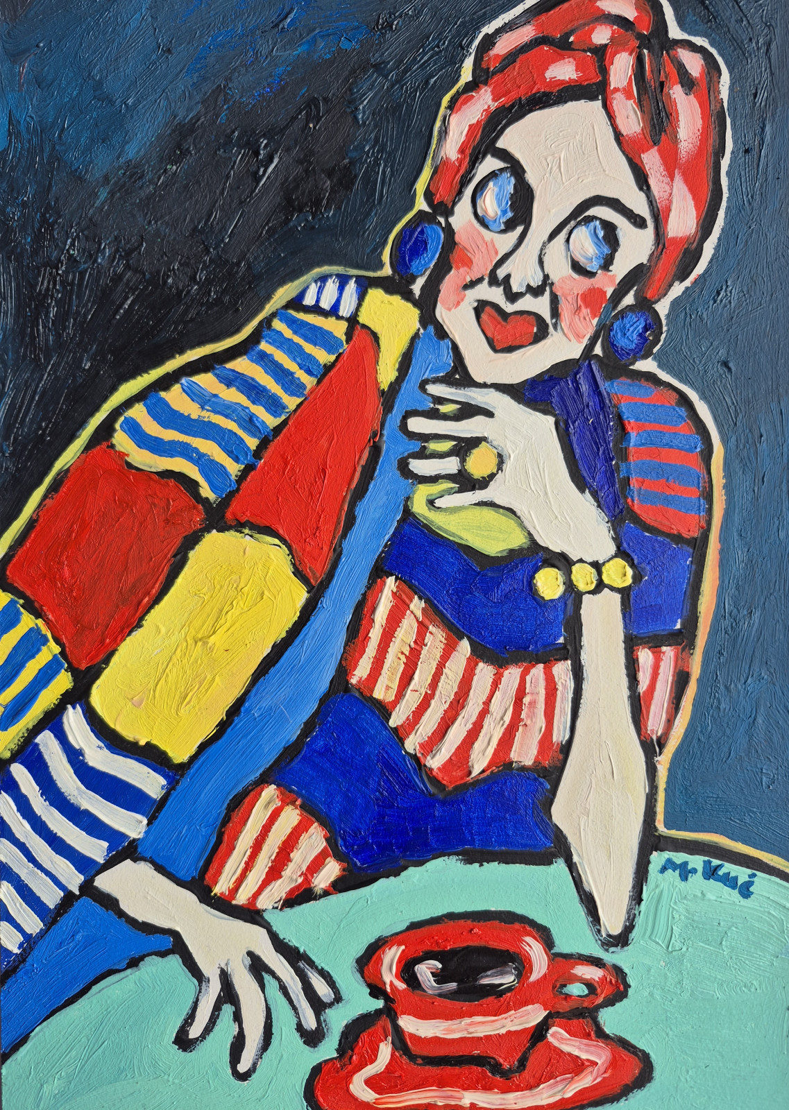Całość ma w sobie coś z ekspresjonizmu i sztuki naiwnej: deformacja, emocjonalność, brak dbałości o realizm przestrzeni. To obraz, który nie opowiada konkretnej historii, lecz raczej zaprasza do odczuwania – trochę jakbyśmy podglądali czyjś wewnętrzny świat, pełen koloru, napięcia i cichej refleksji.