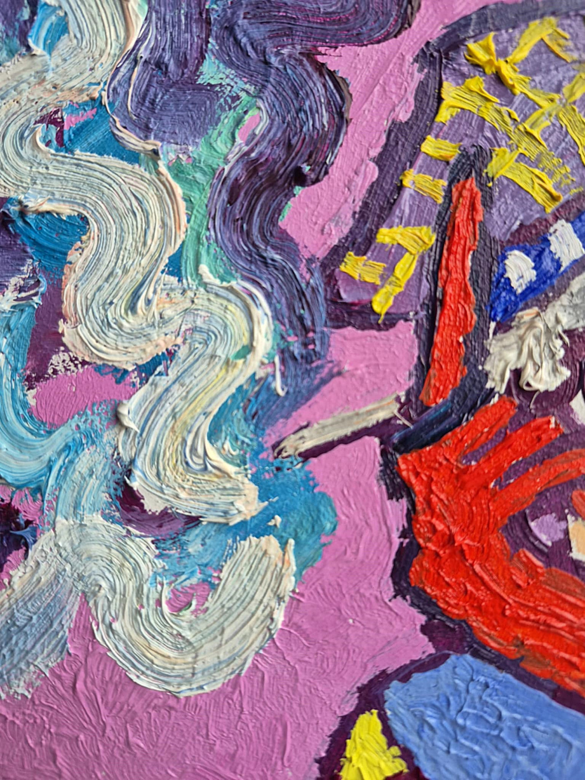 Faktura farby jest gruba, niemal rzeźbiarska, co nadaje obrazowi materialność i energię. Widać wyraźne, ekspresyjne pociągnięcia pędzla, które zdają się pulsować ruchem i emocją.