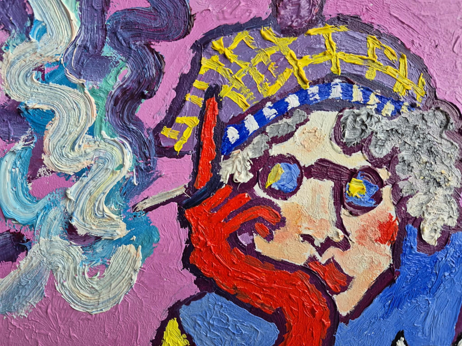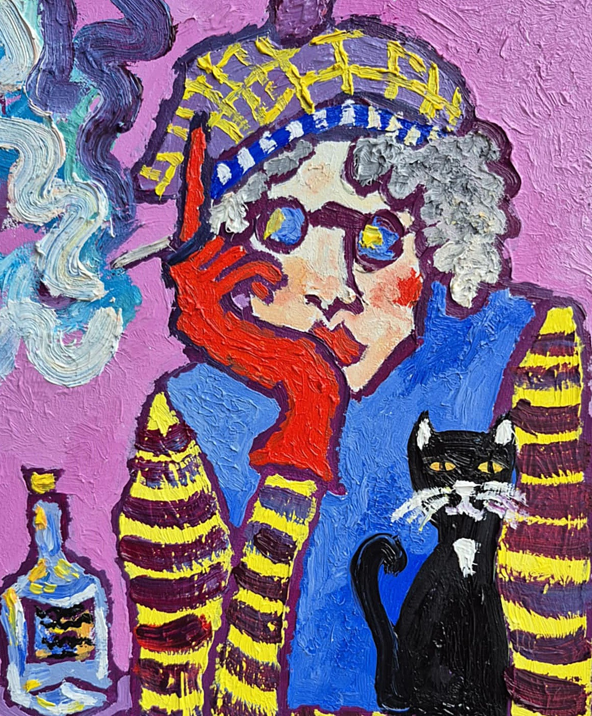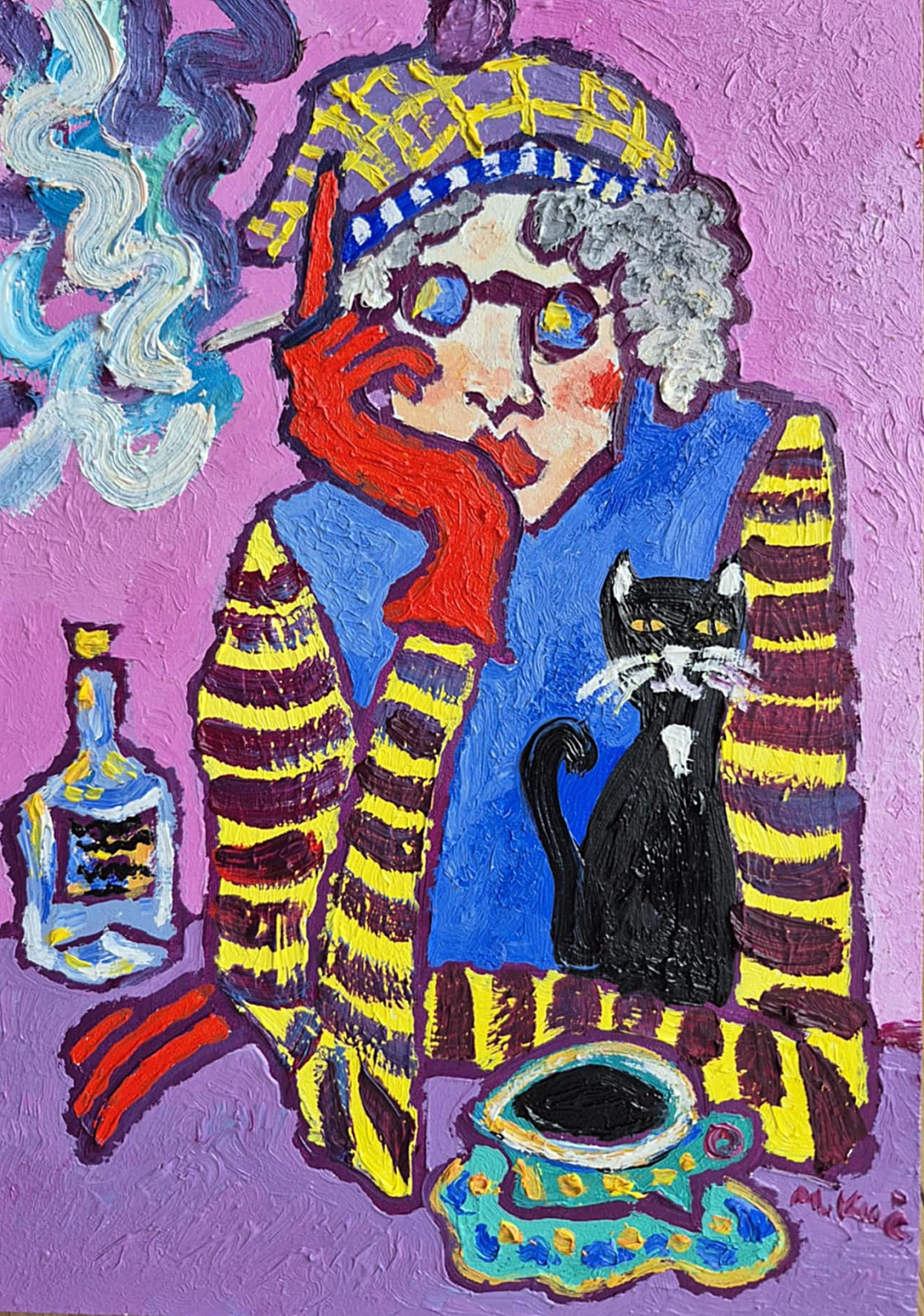 Na pierwszym planie widzimy postać o intensywnie czerwonych rękawiczkach, ubranej w pasiasty, żółto-fioletowy sweter i niebieską kamizelkę. Postać zdaje się pogrążona w zadumie, z papierosem w dłoni, jakby zamyślona nad życiem lub po prostu znudzona codziennością. Towarzyszy jej czarny kot, siedzący spokojnie na stole — symbol niezależności, tajemnicy, może ironicznego towarzystwa w chwilach samotności.