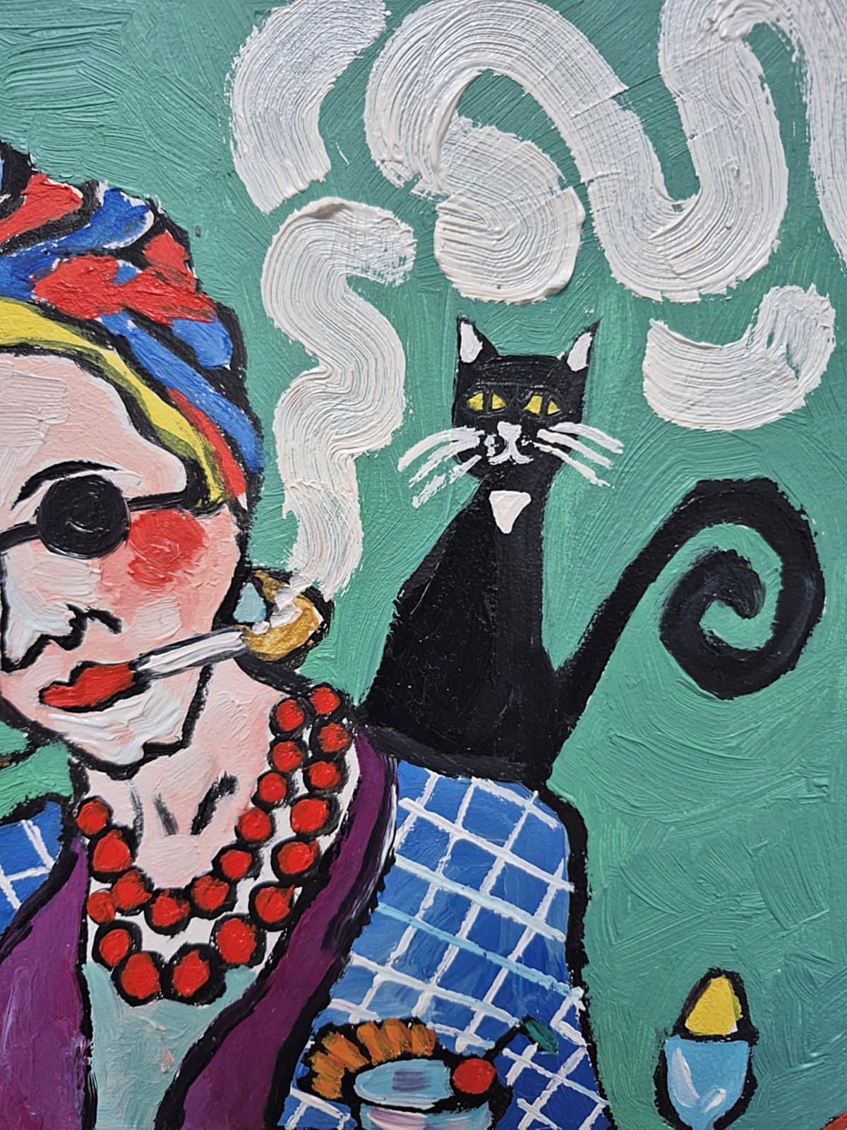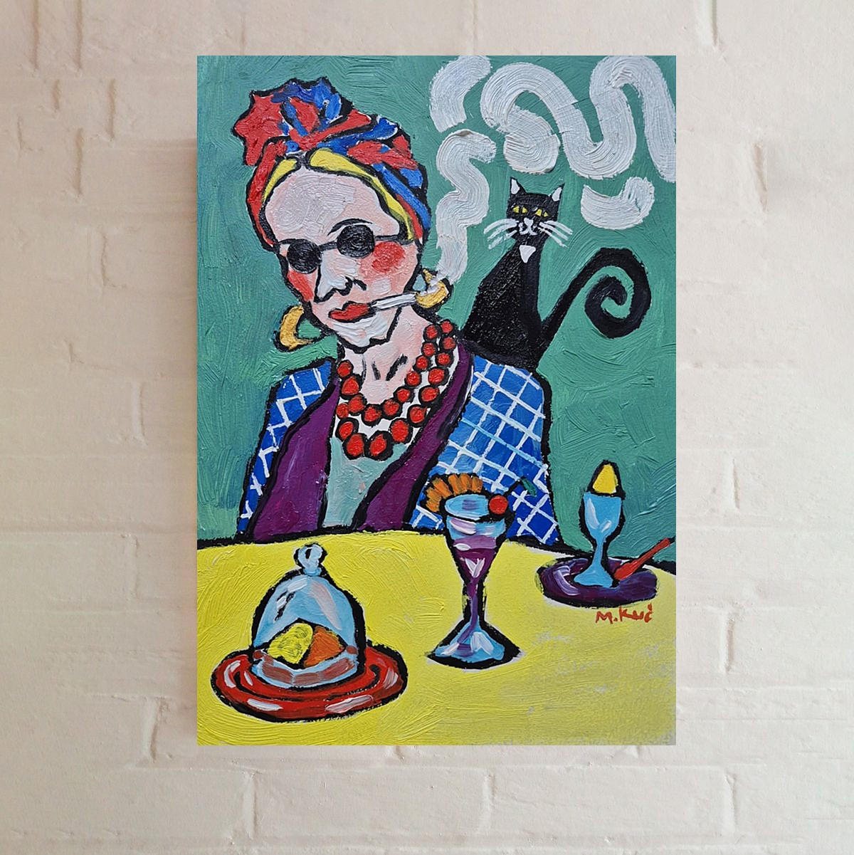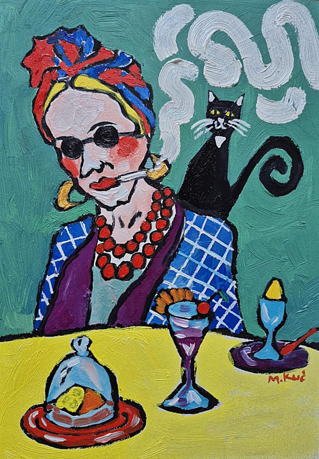 Na zielonym tle siedzi kobieta – nie portret, raczej charakter. Ma twarz zbudowaną z odważnych plam koloru, jakby emocje były ważniejsze niż anatomia. Okrągłe okulary chowają spojrzenie, ale nie tajemnicę. Usta trzymają papierosa – gest nonszalancki, trochę buntowniczy, trochę zmęczony światem. Dym układa się w miękkie, wirujące znaki, niemal jak myśli, które nie chcą zostać nazwane.