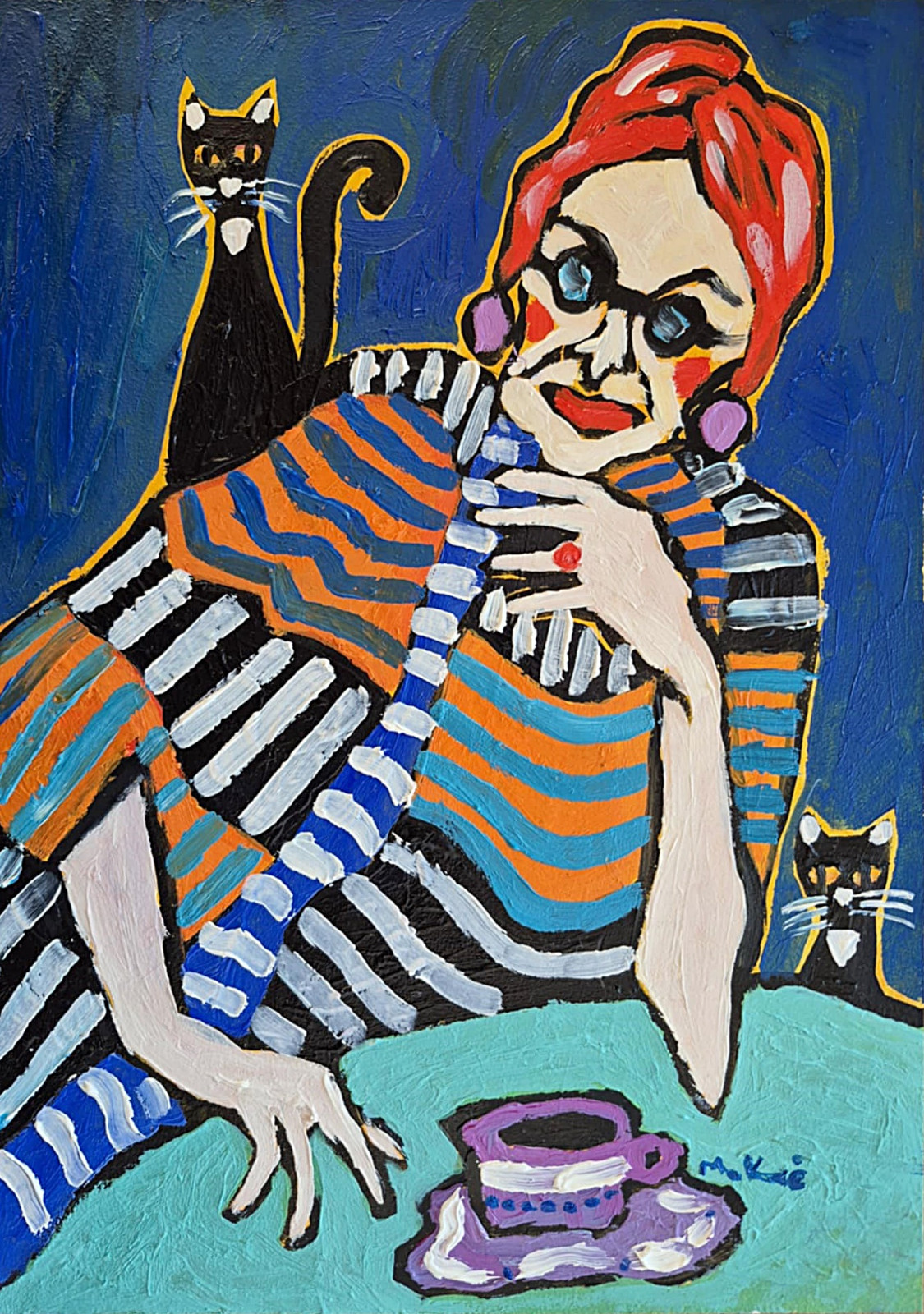 Za nią i obok niej pojawiają się koty: czarne, smukłe, niemal totemiczne. Nie są tylko zwierzętami — są strażnikami nastroju, cichymi świadkami sceny. Ich żółte oczy kontrastują z chłodnym, głębokim błękitem tła, które otula całość niczym nocna cisza.