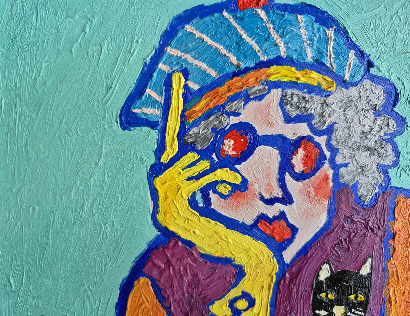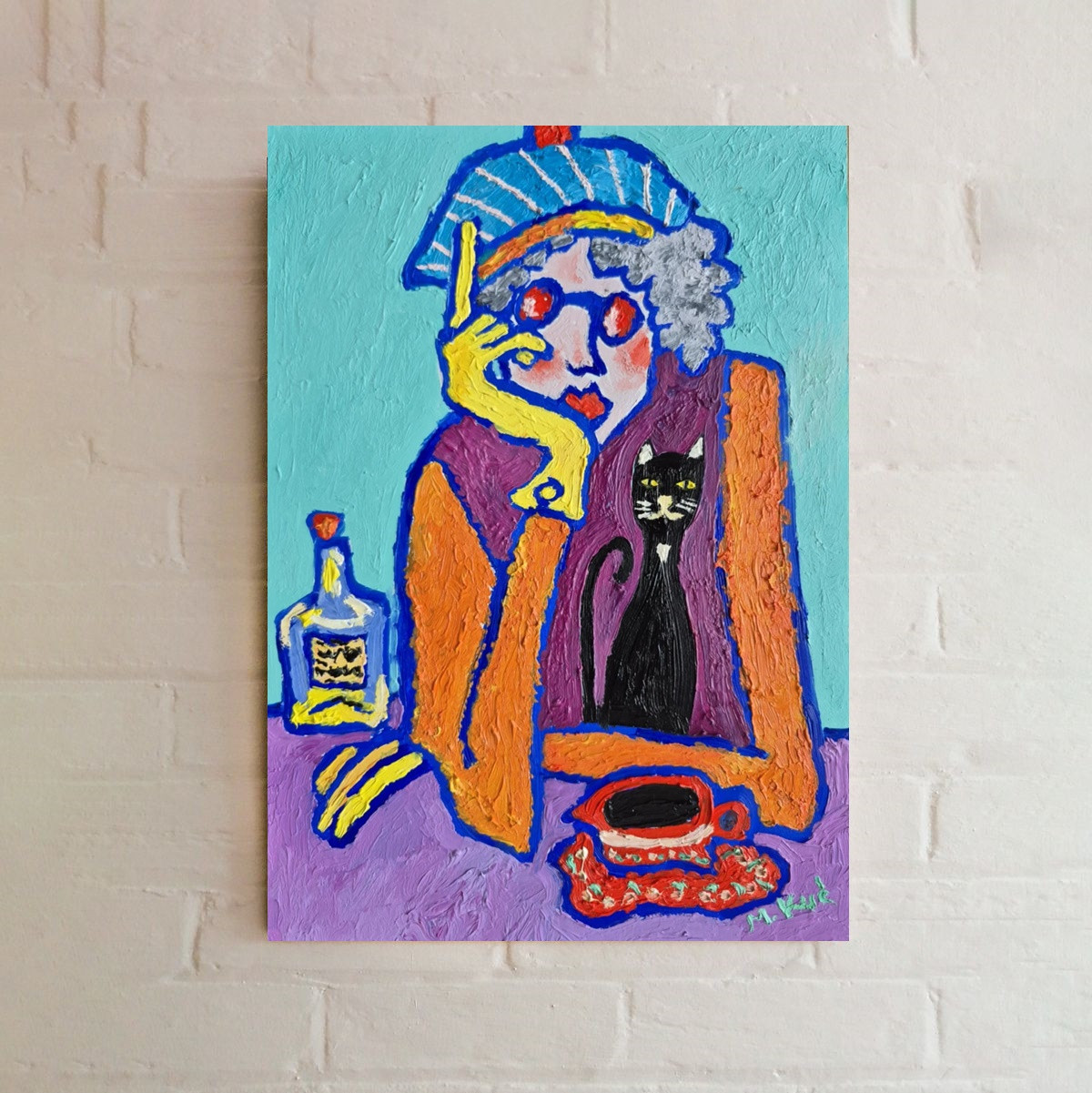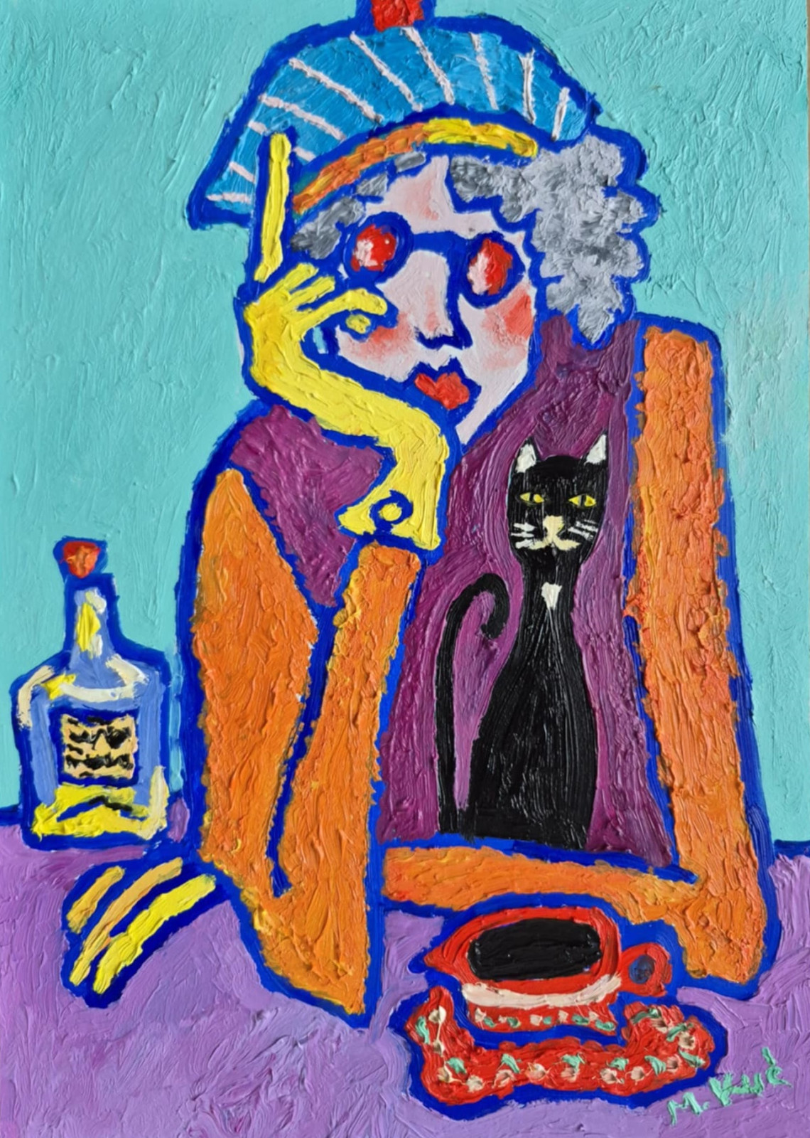 W obrazie Popołudnie z kotem artystka tworzy świat na pograniczu codzienności i fantazji. Bohaterka – kobieta o zamyślonym spojrzeniu, w beretce i z papierosem w dłoni – wydaje się zawieszona między gestem a myślą, między chwilą realną a malarskim snem. U jej boku pojawia się czarny kot – towarzysz milczenia, symbol niezależności i intuicji.
