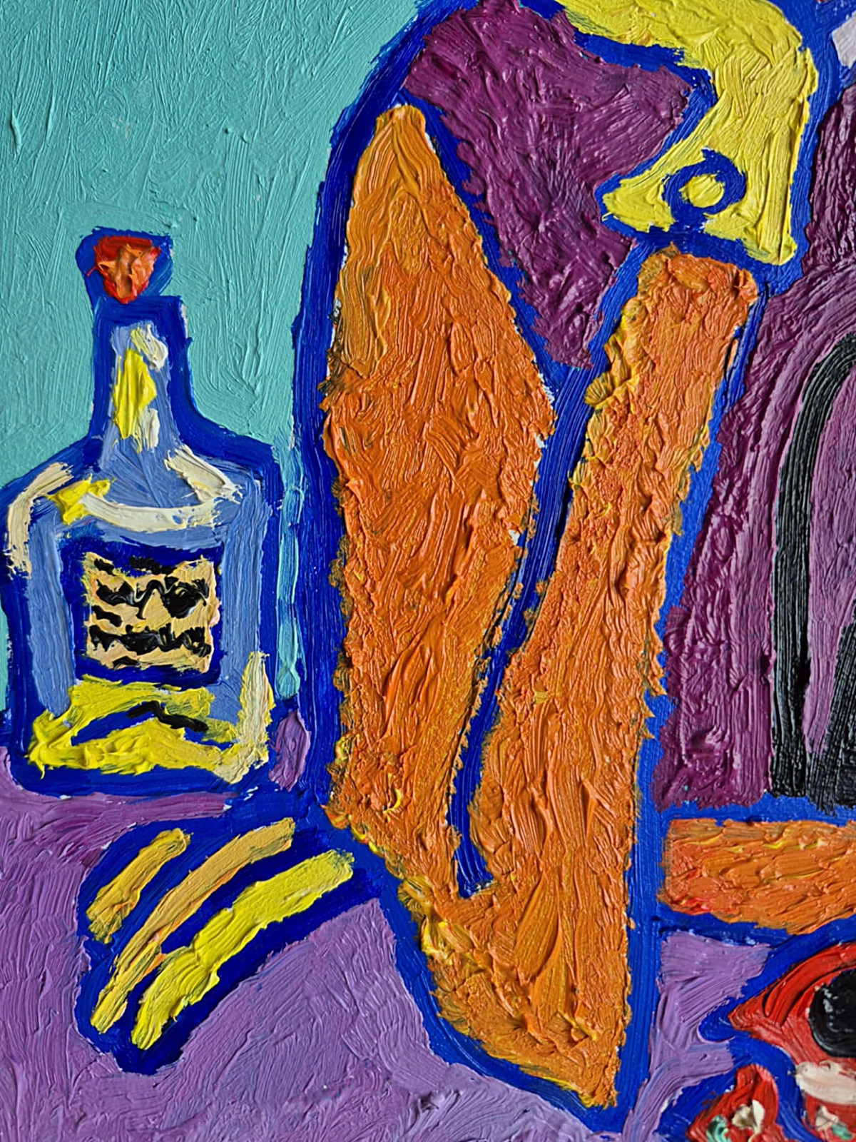 Impastowa faktura farby podkreśla materialność malarstwa, sprawiając, że obraz zdaje się pulsować energią. Zgrzytliwe zestawienia barw i nieco ironiczny ton sceny tworzą aurę melancholii podszytej humorem.
