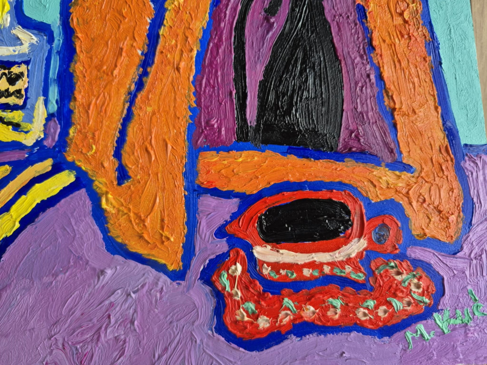 Kompozycja zbudowana jest z silnych, niemal dziecinnych konturów i nasyconych barw: turkusowego tła, fioletów, oranżów i cytrynowej żółci. Kolor staje się tu językiem emocji – ekspresyjnym, bezkompromisowym, wolnym od realizmu. Artystka sięga po środki charakterystyczne dla ekspresjonizmu i sztuki fowistycznej, gdzie emocja góruje nad formą, a kontur podkreśla indywidualność postaci.
