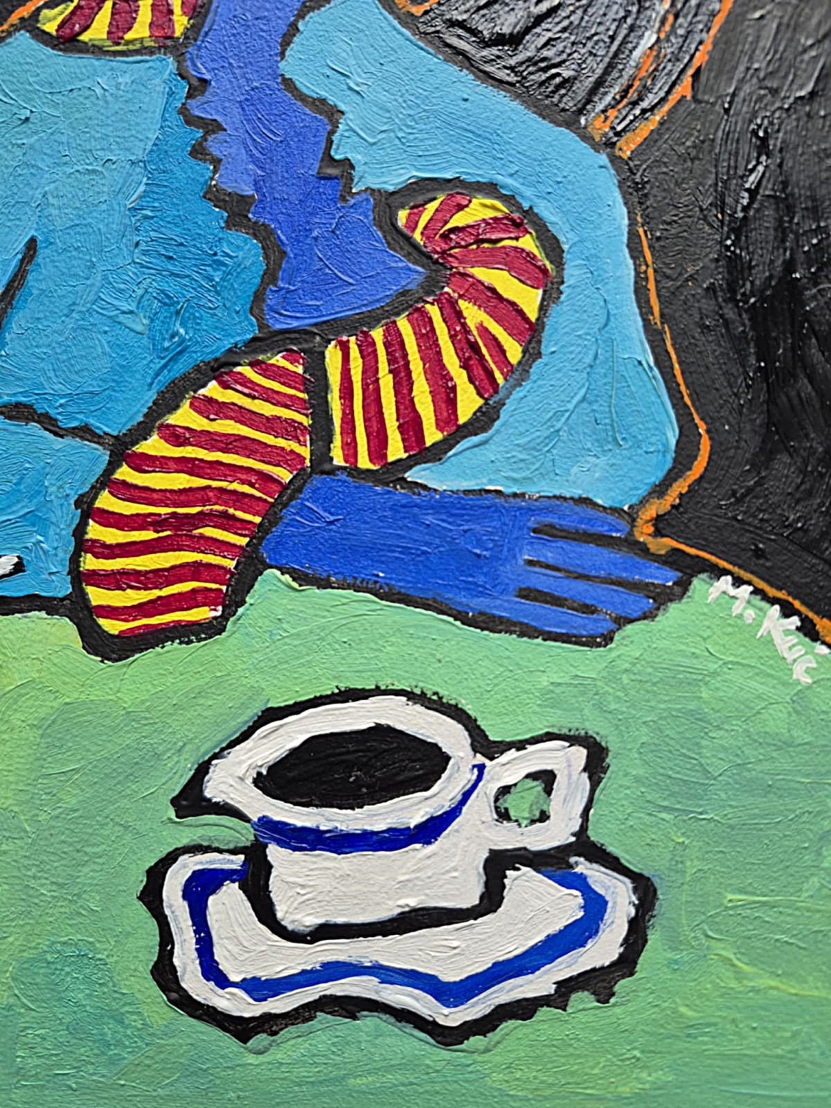 Jej sylwetka jest nienaturalnie uproszczona, niemal „poskładana” z plam koloru: błękit sukienki, pasiasty czerwono-żółty element wijący się przez ciało jak szal albo wąż, rękawiczki w odcieniach niebieskiego. Wszystko to obwiedzione jest nerwową, pomarańczową linią, która trzyma formy w ryzach, ale też podkreśla ich sztuczność.