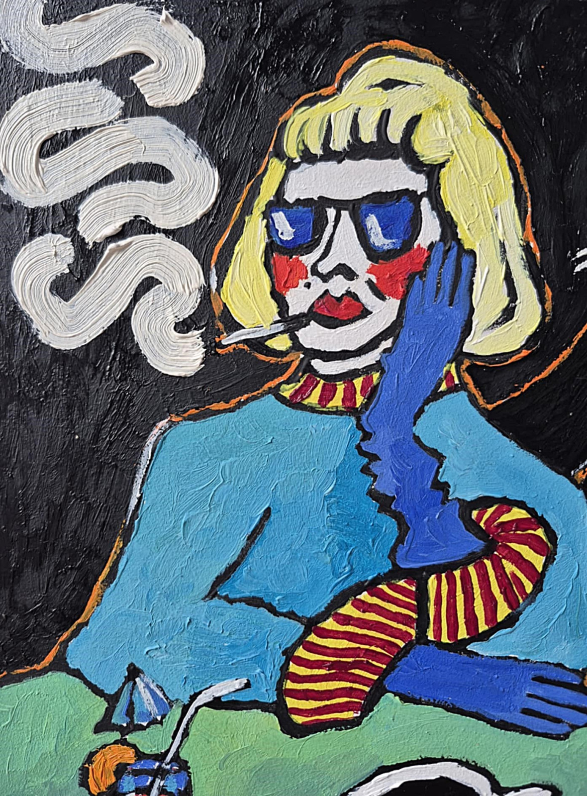 Na ciemnym, niemal nocnym tle wyłania się postać kobiety o jasnych, żółtawych włosach i twarzy zbudowanej z kontrastów: bladej bieli, intensywnej czerwieni policzków i ust oraz chłodnego błękitu okularów. Jej spojrzenie jest ukryte, odgrodzone szkłem – jakby była obecna, ale jednocześnie zdystansowana. Papieros w ustach i unoszący się obok miękki, falujący dym nadają scenie leniwy, lekko dekadencki rytm.