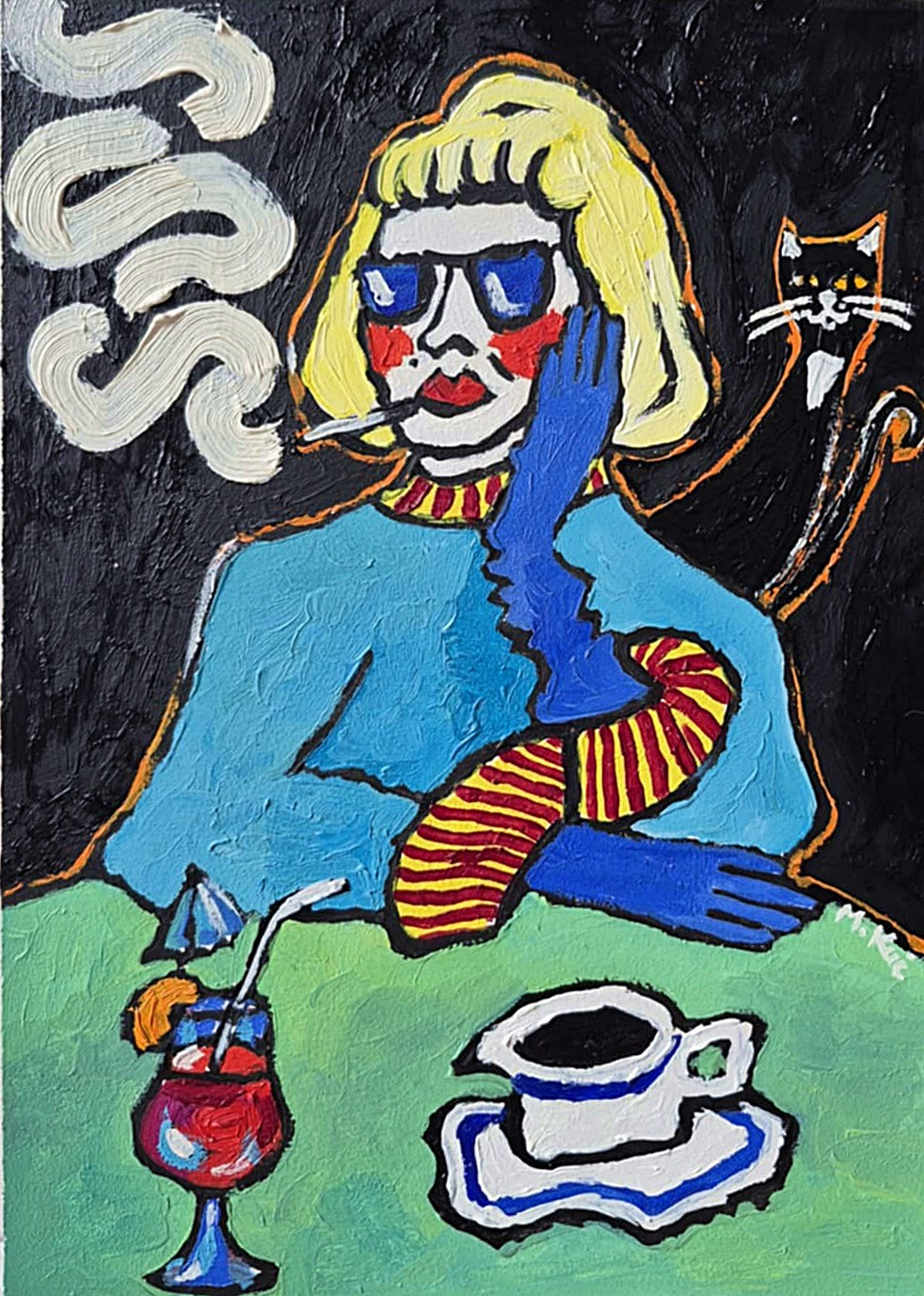 Na stole – zielonym jak scena teatralna – stoją dwa rekwizyty codzienności: filiżanka kawy oraz koktajl w kieliszku, z parasolką i słomką. To symbole przyjemności, chwili zawieszenia, miejskiego rytuału. Z prawej strony obrazu pojawia się czarny kot – smukły, czujny, trochę ironiczny obserwator. Jego obecność dodaje nuty tajemnicy i lekkiej niepokoju.