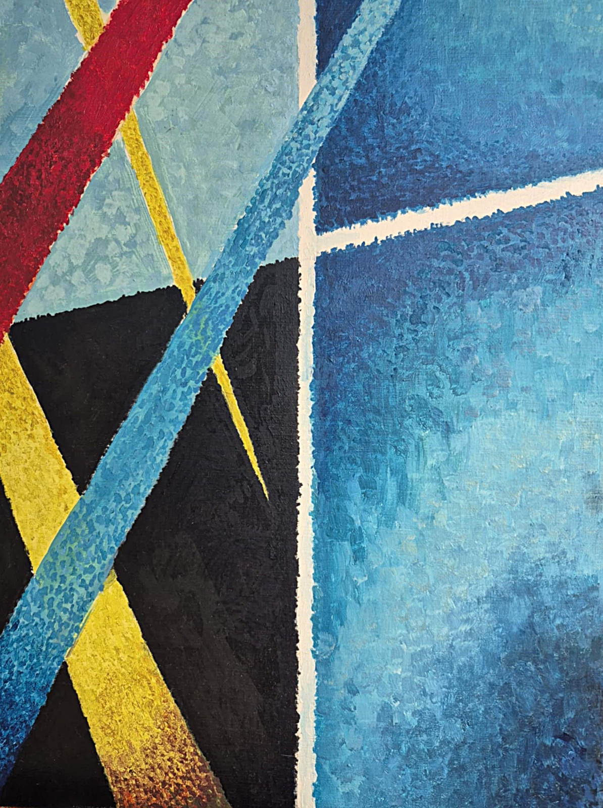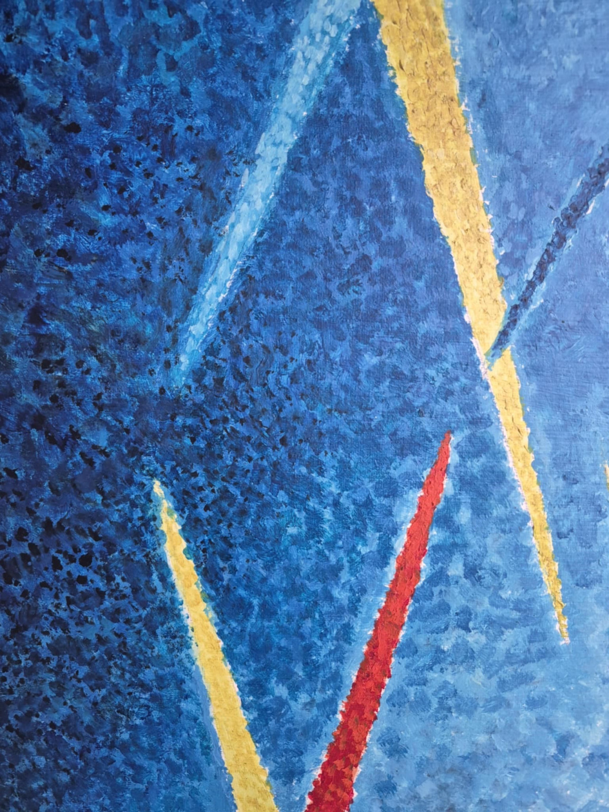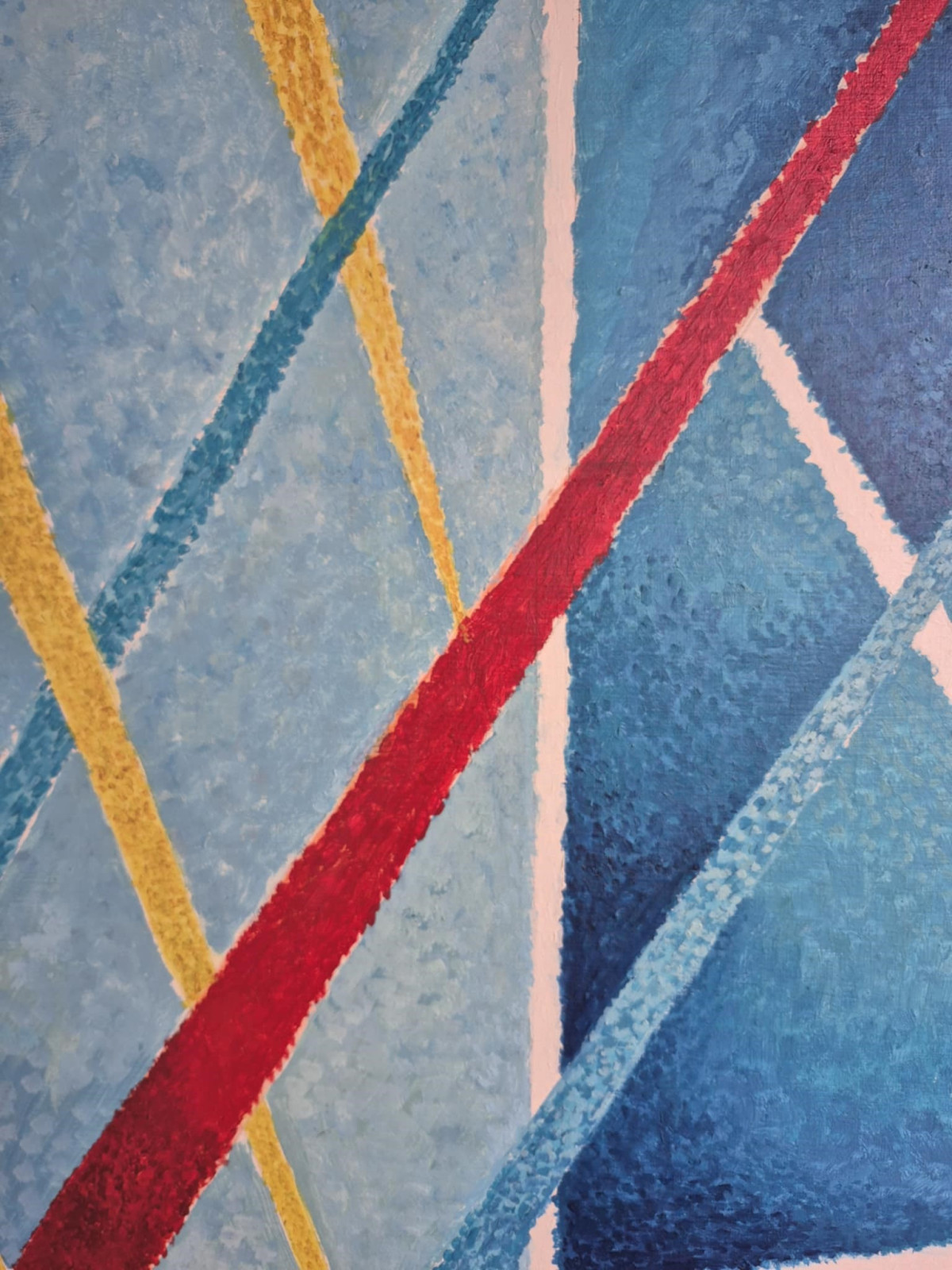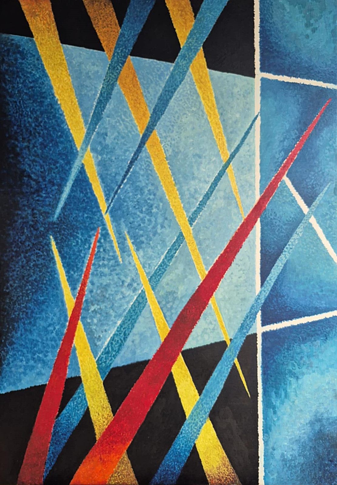 Ten obraz przypomina wizualną symfonię napięć i ruchu. Dominują chłodne odcienie błękitu, które tworzą tło przypominające fragmenty rozbitej przestrzeni — jakby szkło lub architektura widziana przez pryzmat. Przez tę spokojną, niemal lodowatą strukturę przecinają się ostre, dynamiczne linie w intensywnych kolorach: żółtym, czerwonym i turkusowym.