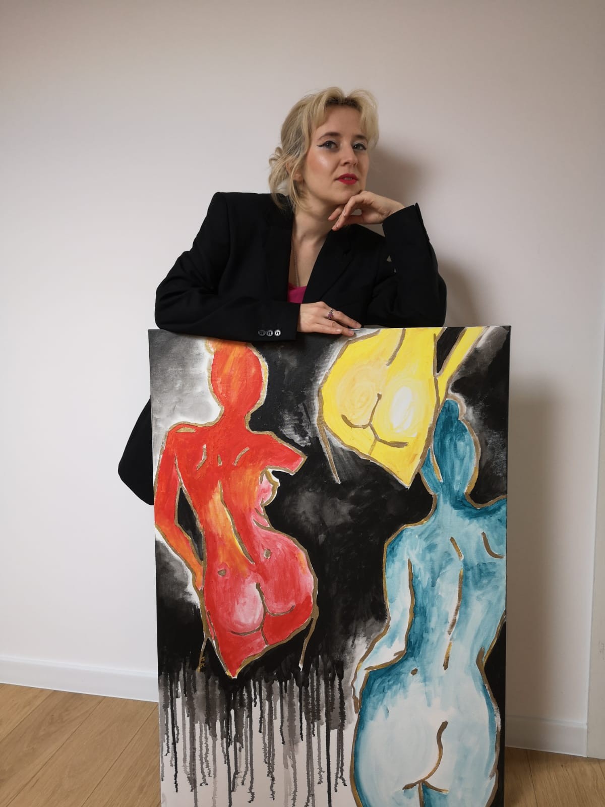 Obraz namalowany techniką akrylową na blejtramie o wymiarach: 100/70 cm, boki obrazu zamalowane, sygnowany z tyłu. Jest to moja autorska kompozycja. Świetnie może być eksponowany w nowoczesnych wnętrzach o stonowanej kolorystyce. Swoimi barwami może rozjaśnić takie wnętrza, w oświetleniu dziennym, jak i sztucznym. Polecany dla miłośników aktów i nie tylko.