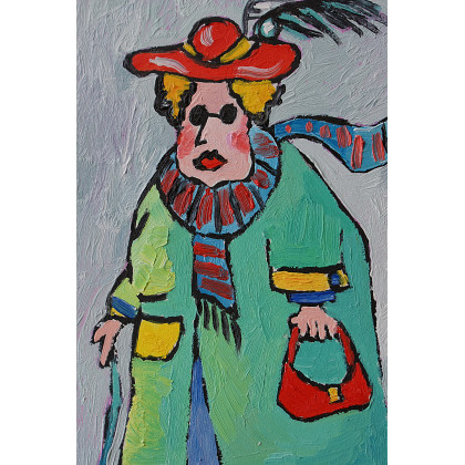 Obraz ukazuje postać kobiety o jaskrawych kolorach, ubrana w turkusowy płaszcz, czerwony kapelusz z piórem i fikuśne buty na obcasie. Obok niej dumnie kroczy uroczy kot w pomarańczowe paski, wyglądający jak radosna chmurka. Artysta zastosował technikę impasto, co dodaje kompozycji wyrazistości i faktury. Pociągnięcia pędzla są grube, niemalże można je poczuć pod palcami. Tło w pastelowych odcieniach różu i niebieskiego delikatnie kontrastuje z wyrazistymi liniami postaci, podkreślając figlarność i humor całej sceny.