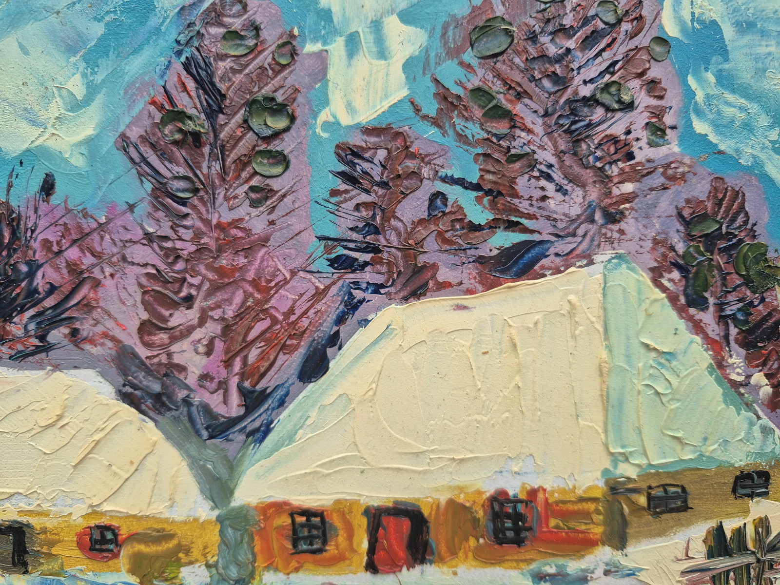 Za domami wyrastają drzewa w odcieniach fioletu i purpury, nierealne, niemal senne. Ich korony są ciężkie, pełne rytmu i powtórzeń, jak echo zimowego wiatru. Nie są realistyczne — raczej emocjonalne, symboliczne, jak wspomnienie krajobrazu, a nie sam krajobraz.