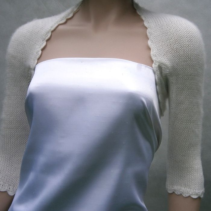 Delikatne bolerko wykonane z antyalergicznej włóczki (50% bawełna, 50% akryl) z niewielkim włoskiem w kolorze ecru.