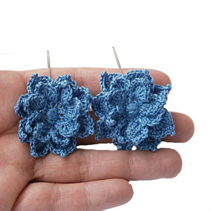 Leciutkie, delikatne kolczyki wykonane z kordonka ( bawełna 100%). Stylizowane kwiaty zawieszone na antyalergicznych biglach - rybkach. Rozpiętość płatków - 4 cm. Długość razem z biglami - około 7 cm.