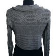 Sweterek zrobiony ręcznie z wysokogatunkwej przędzy (50% wełna, 50% akryl) w różnych odcieniech szarości. Wysoki ściągacz na rękawach zrobiony tym samym wzorem co szalowy kołnierz. Na rękawach oryginalny wzór stylizowanych warkoczy biegnący również przez cały tył. W zestawie broszka, dzięki której na różne sposoby można wystylizować sweterek.