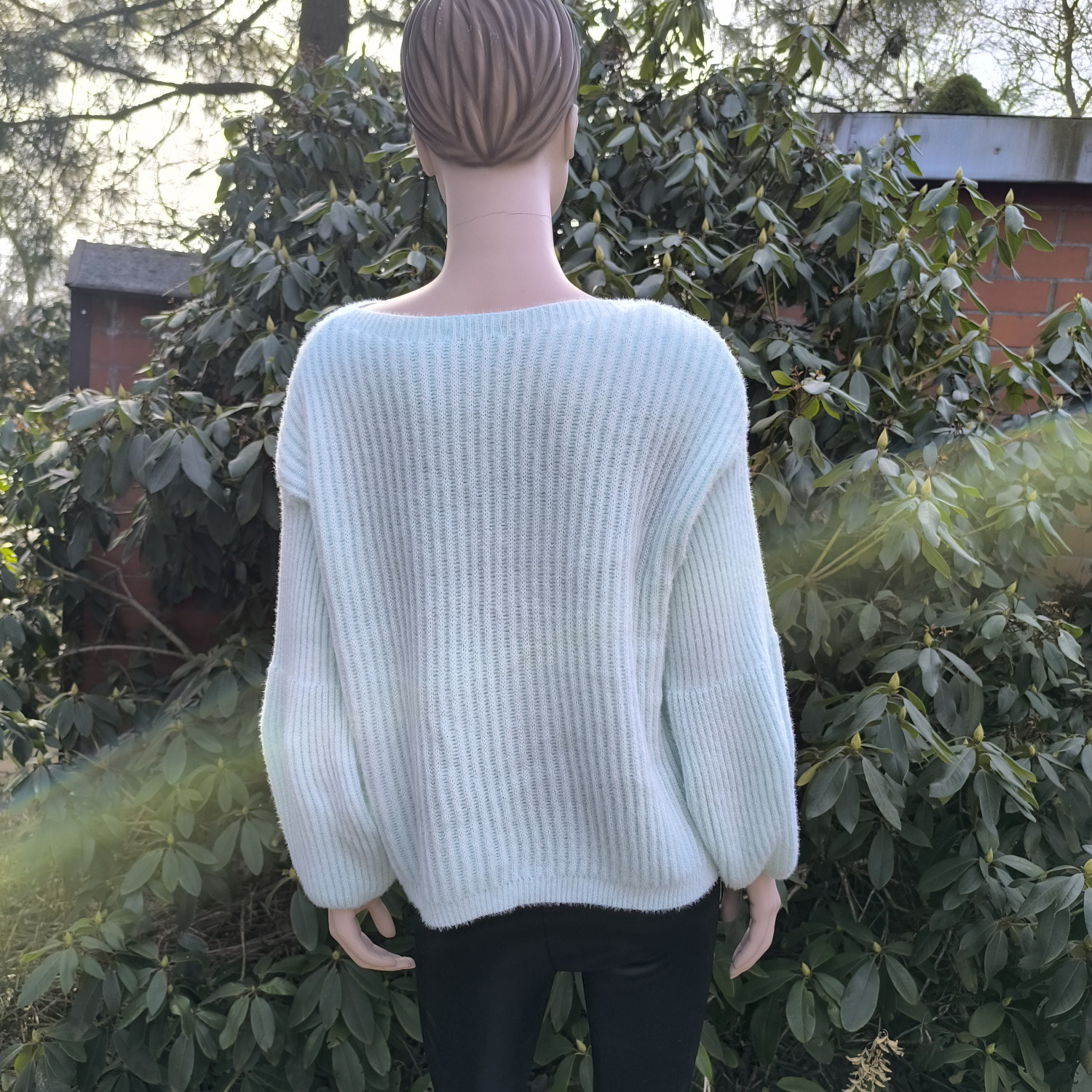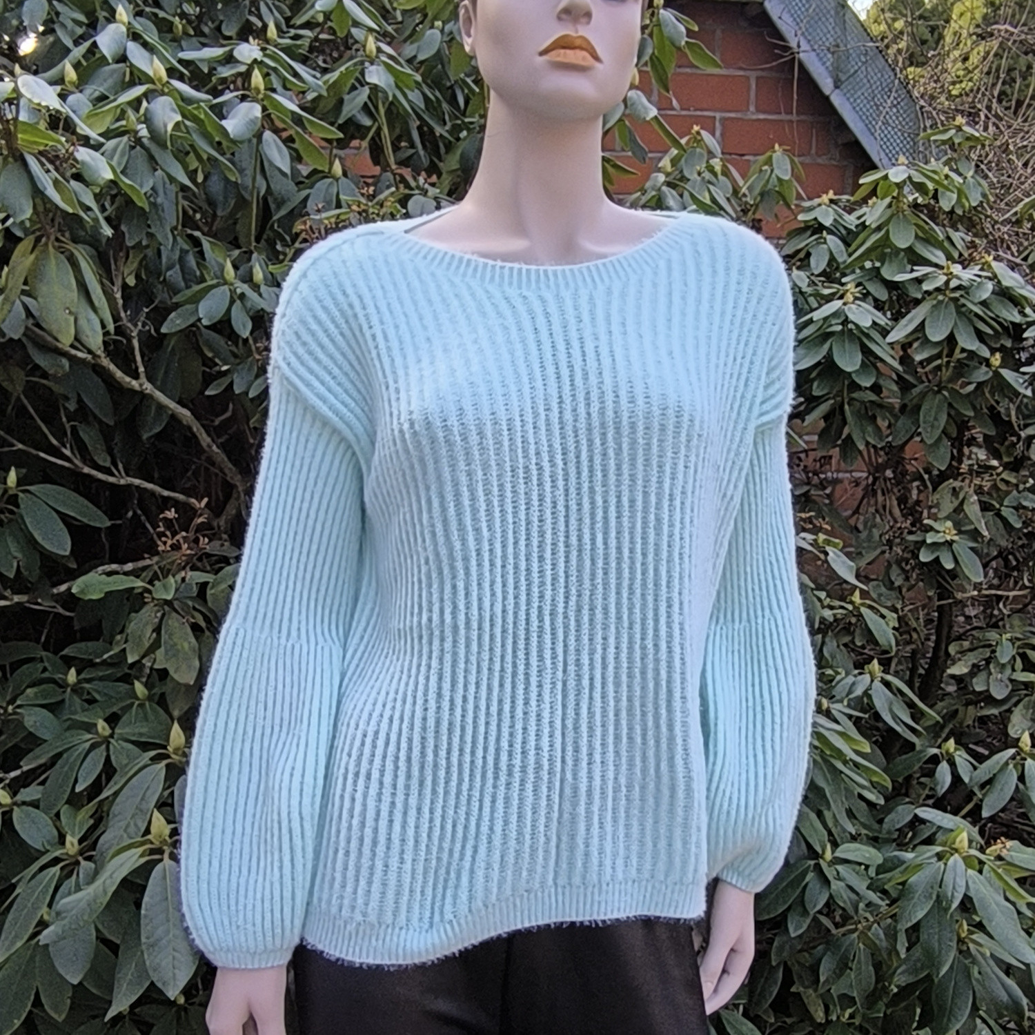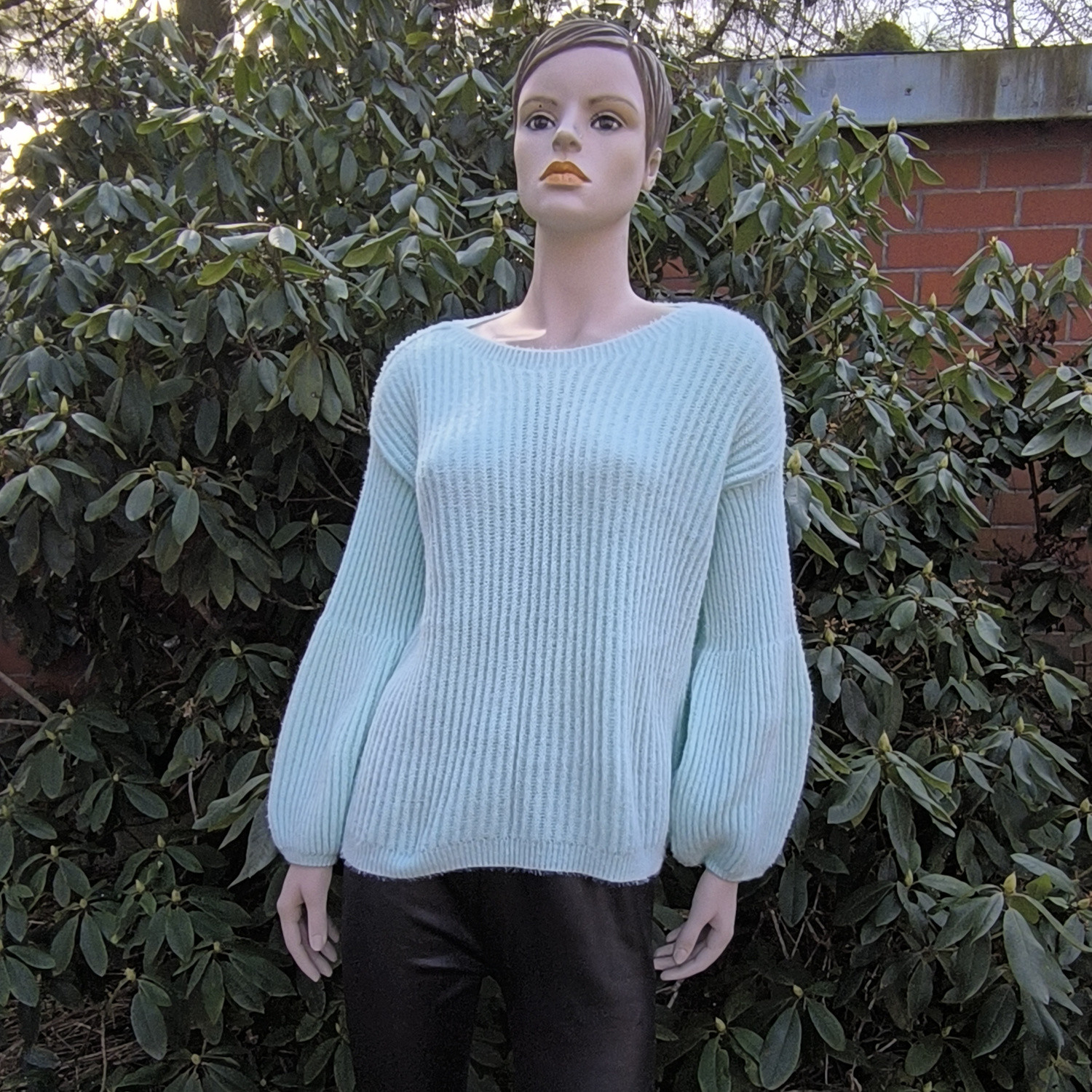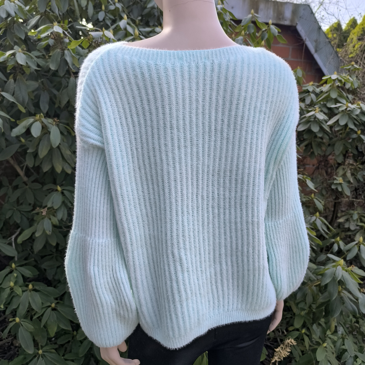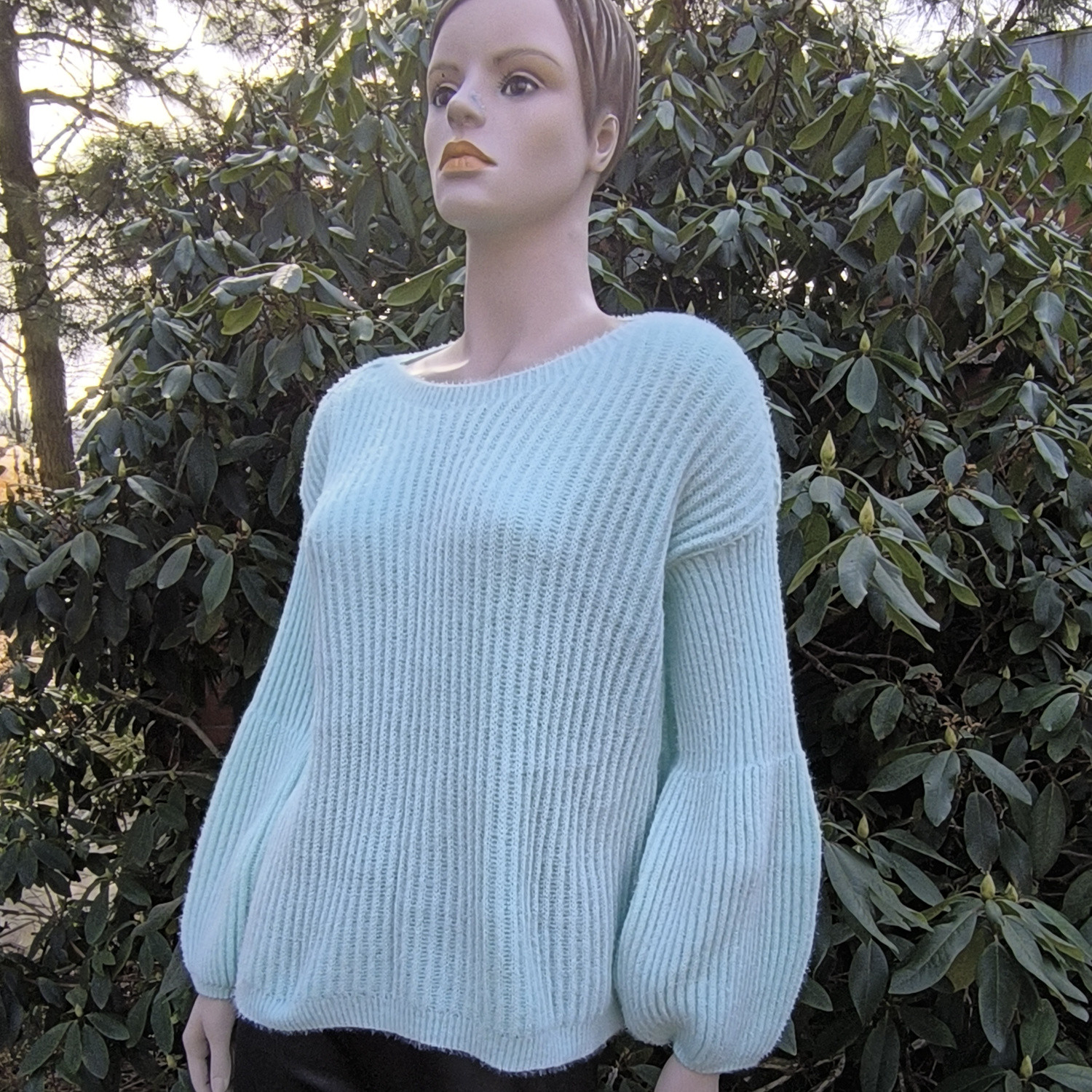 Miętowy, oversizowy sweter z bufkami