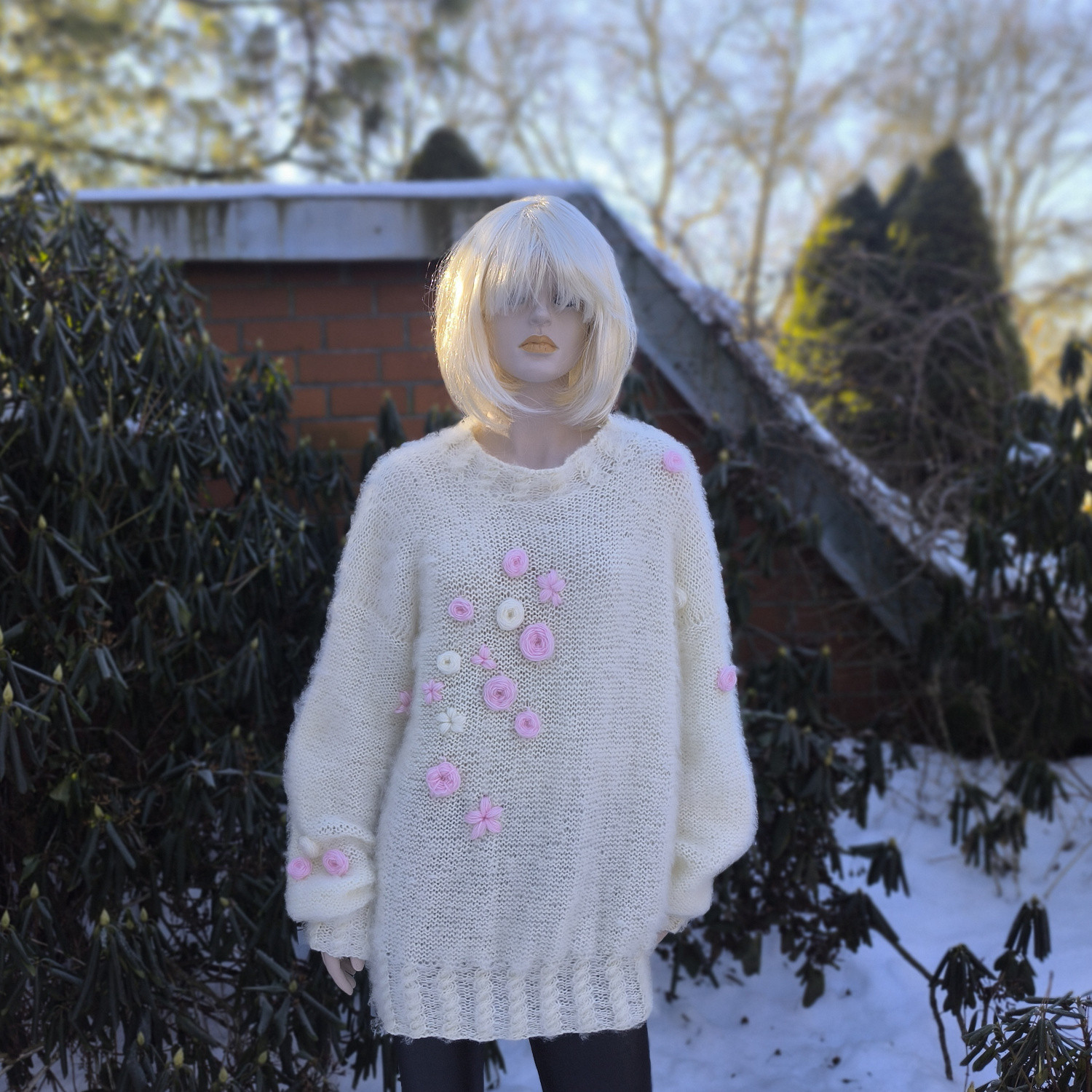 Ten duży, oversizowy sweter w kolorze ecru to wyjątkowe połączenie luksusu, delikatności i rękodzieła.