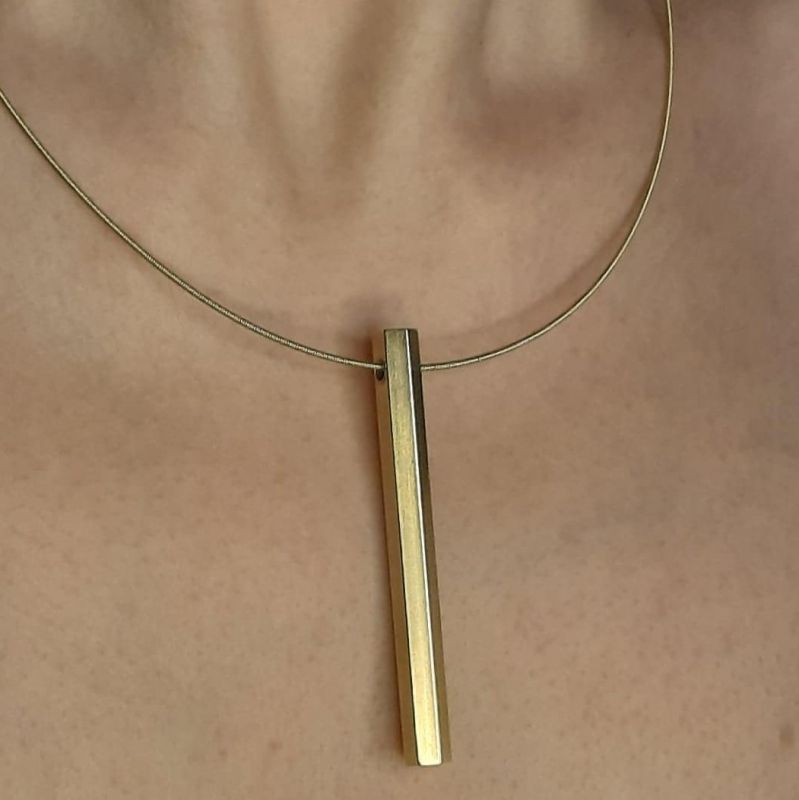 Naszyjnik od podstaw wykonany ręcznie z mosiądzu o wymiarach : wysokość 60 mm, szerokość 6,3 mm, zawieszony na strunie długości 44 cm z bardzo wygodnym zapięciem. Długość obroży można dobrać indywidualnie.