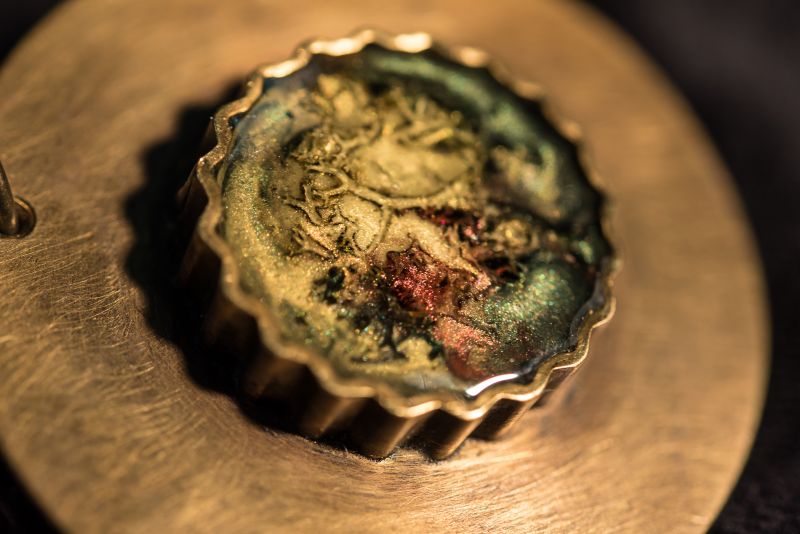 Industria - naszyjnik wykonany z mosiądzu, żywicy epoksydowej oraz barwionych materiałów przyrodniczych, mosiądz został pokryty patyną.