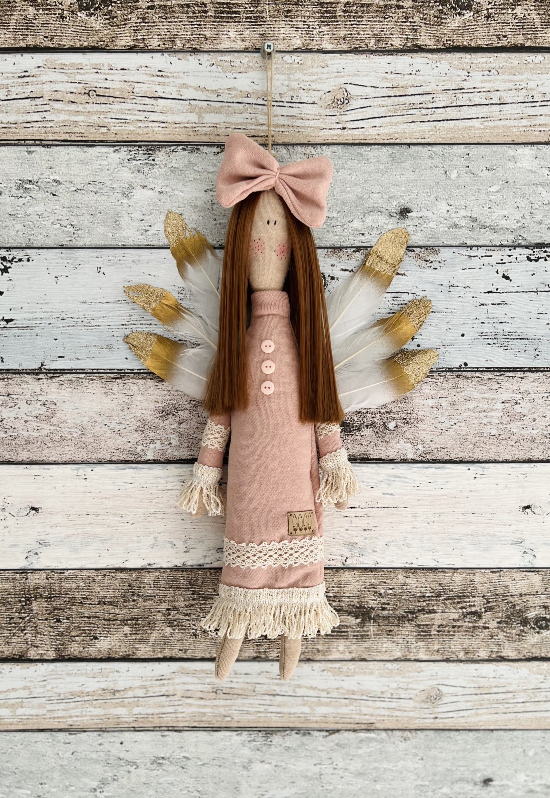 Anioł mierzy ok. 47-50 cm, jest artykułem zero waste. Jedynym nowym elementem są zastosowane pióra. Guziki i włosy pozyskiwane są z końcówek producenckich i z drugiego obiegu, tkaniny z moich kolekcji odzieżowych. Anioły mogą nieznacznie różnić się od siebie.